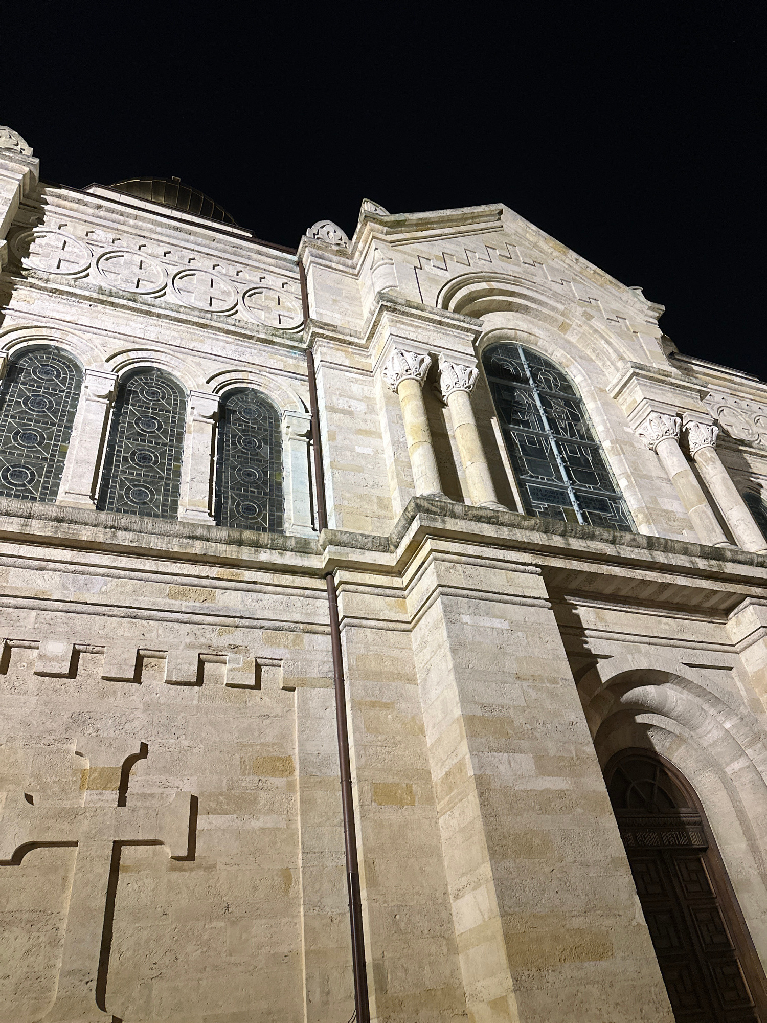 The image shows a portion of the exterior of the Dormition of the Mother of God Cathedral in Varna, Bulgaria, taken at night. The building is constructed of light-colored stone or concrete, featuring…read more