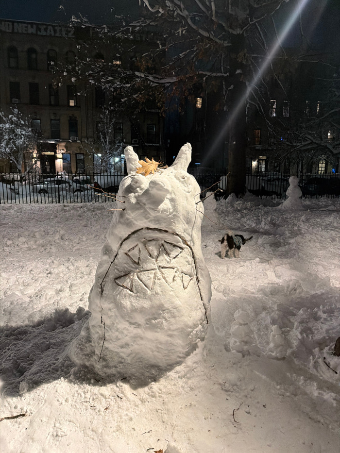 An outdoor nighttime scene depicts a large, irregularly shaped snow sculpture resembling an animal, possibly a cat, adorned with a leaf. Geometric designs are carved onto its side. Patches of snow cov…read more