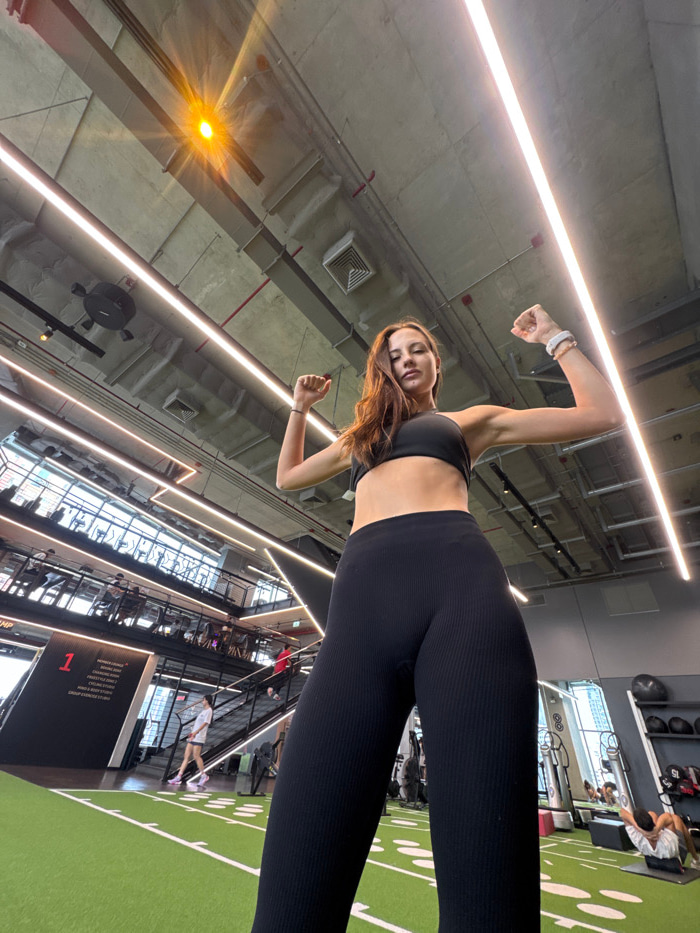 The image displays the interior of a multi-level fitness facility, identified as a Virgin Active gym, located within the city of Bangkok, Thailand. A female subject, appearing to be in her twenties or…read more