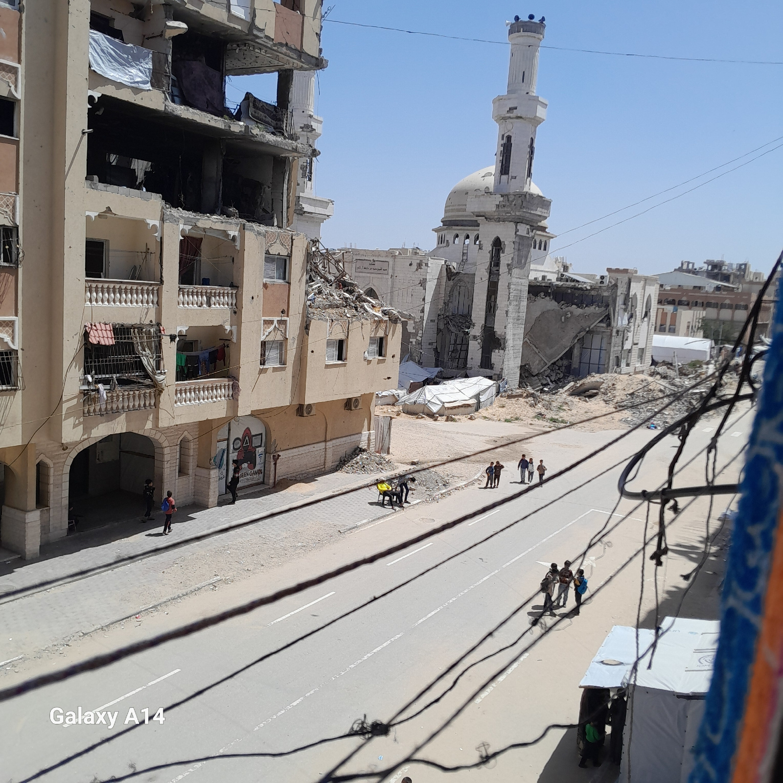 The image shows a street scene in Khan Yunis, Palestinian Territory, characterized by destruction and displacement. A mosque with a distinctive minaret is visible among damaged buildings, indicating t…read more