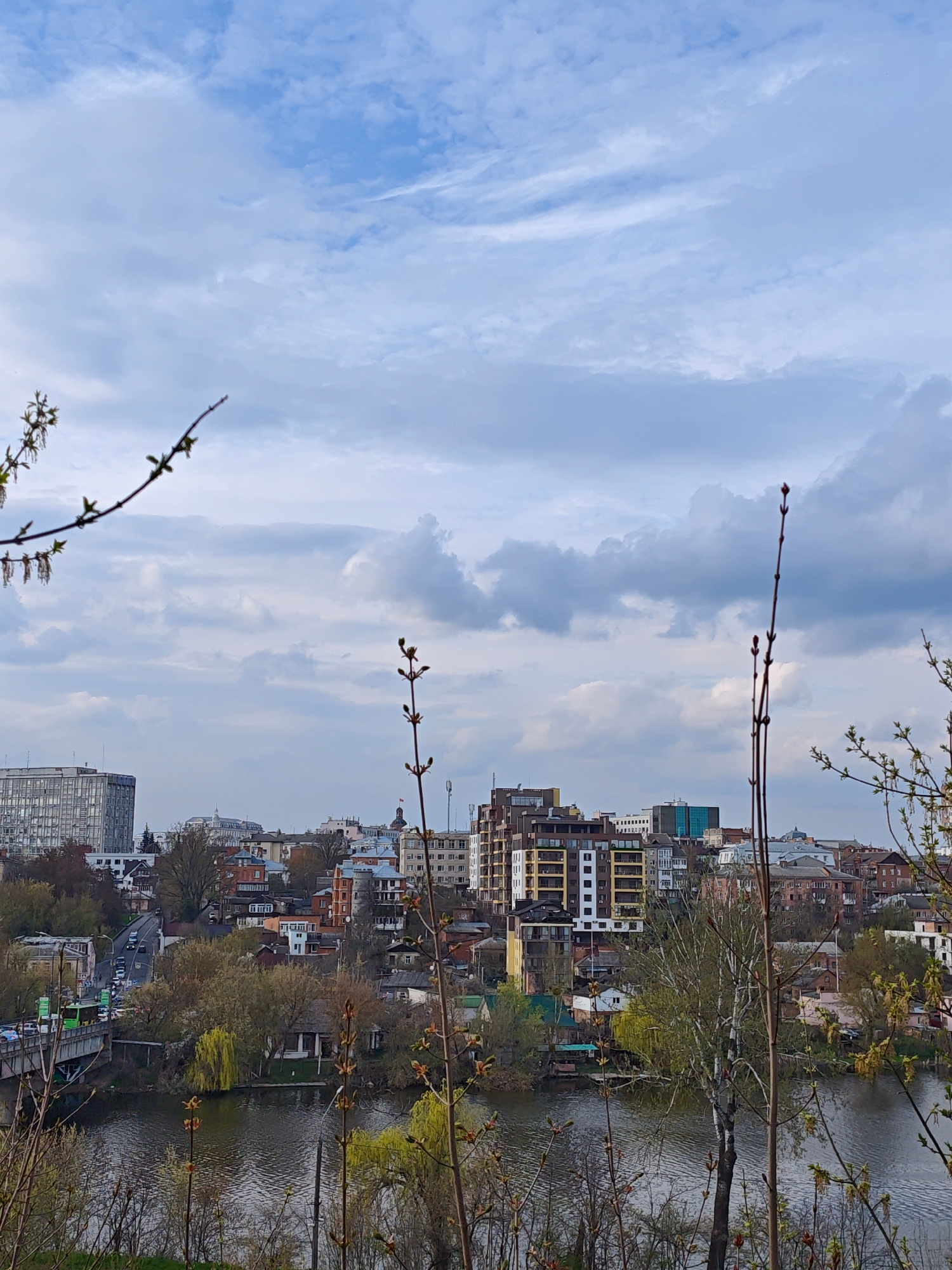 This elevated landscape shot captures a panoramic view of Vinnytsia, Ukraine, observed from a high vantage point, likely a hillside or embankment. The scene depicts a city unfolding along a river unde…read more