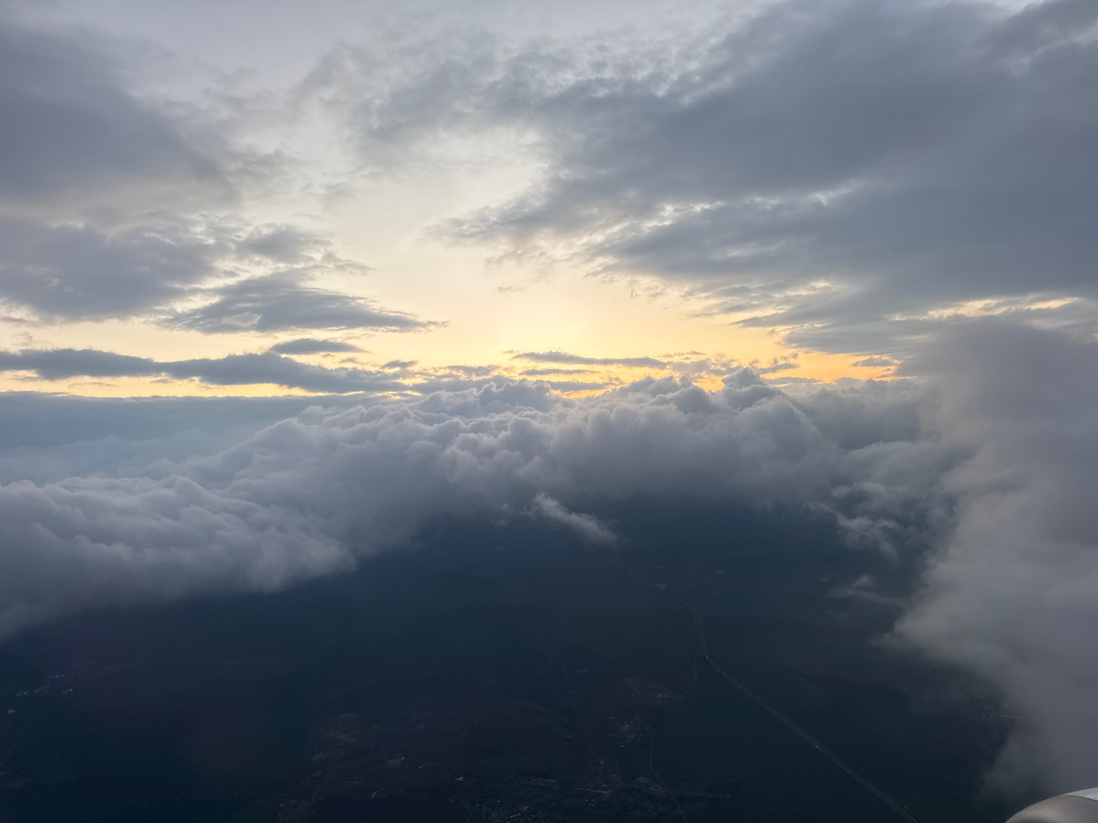 This media file presents an aerial view from an airplane, capturing a dramatic sky and cloudscape during either sunrise or sunset. The upper portion of the image reveals a vast sky dominated by scatte…read more