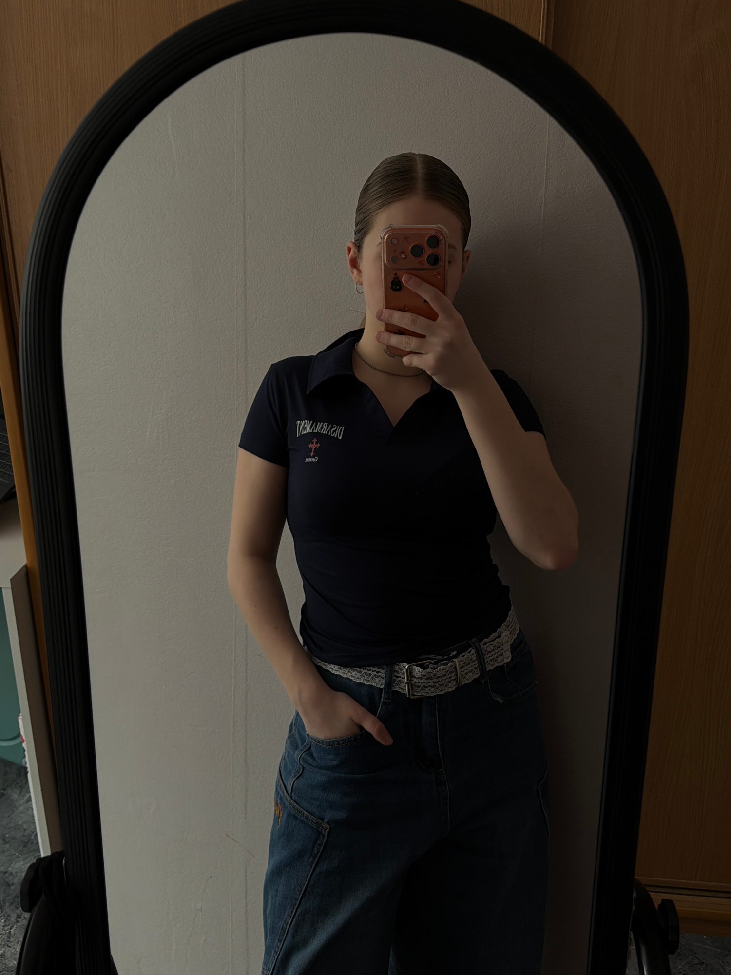 A person is taking a mirror selfie with a phone. The person is wearing a dark blue shirt with white lettering, blue jeans with a lace belt, and a necklace. The mirror has a thick black frame. The back…read more