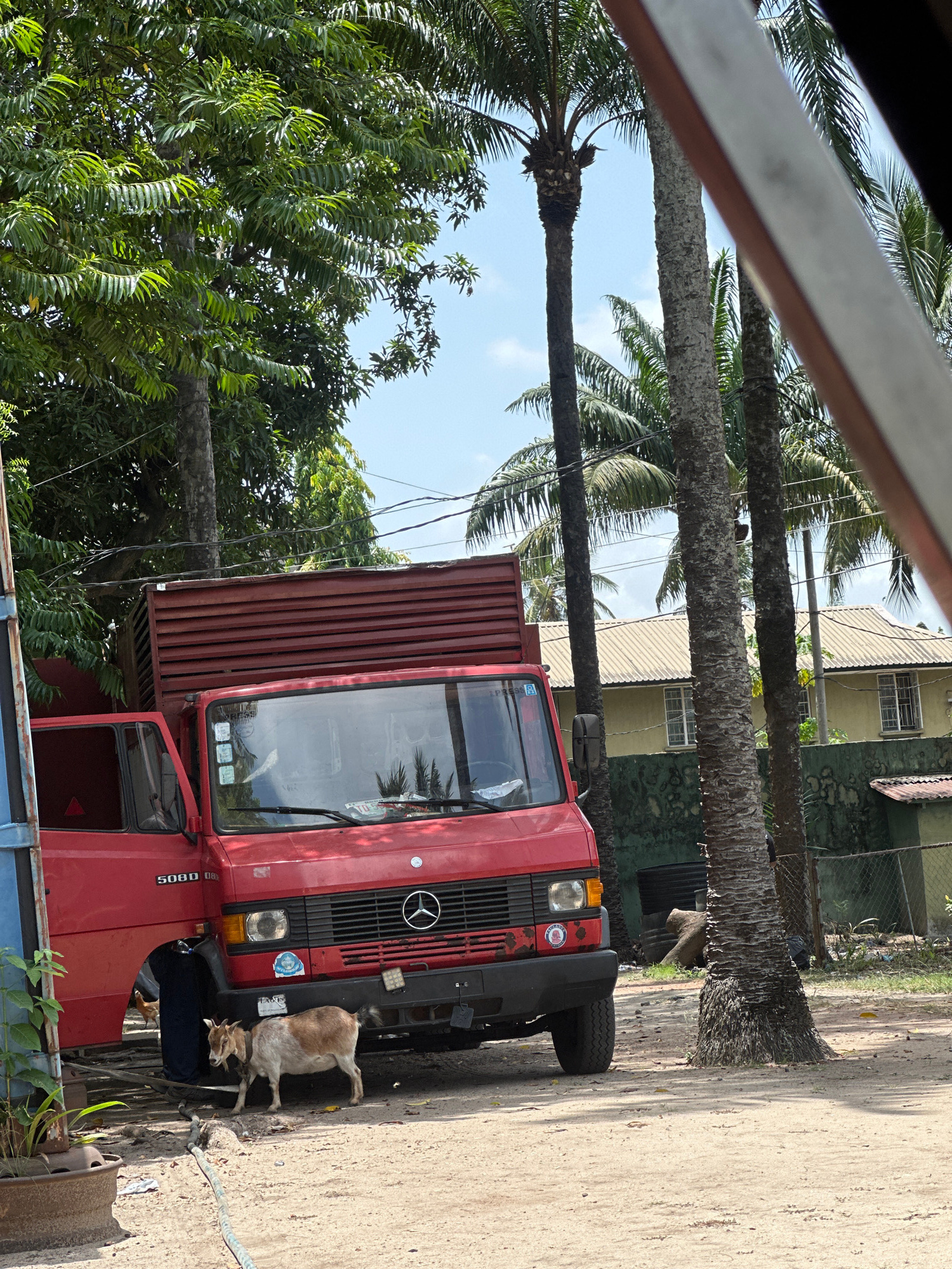 The image depicts a red Mercedes-Benz 508D truck parked on a dirt road in what appears to be a tropical environment. The truck has an open door and a cargo container attached. A goat is lying on the g…read more
