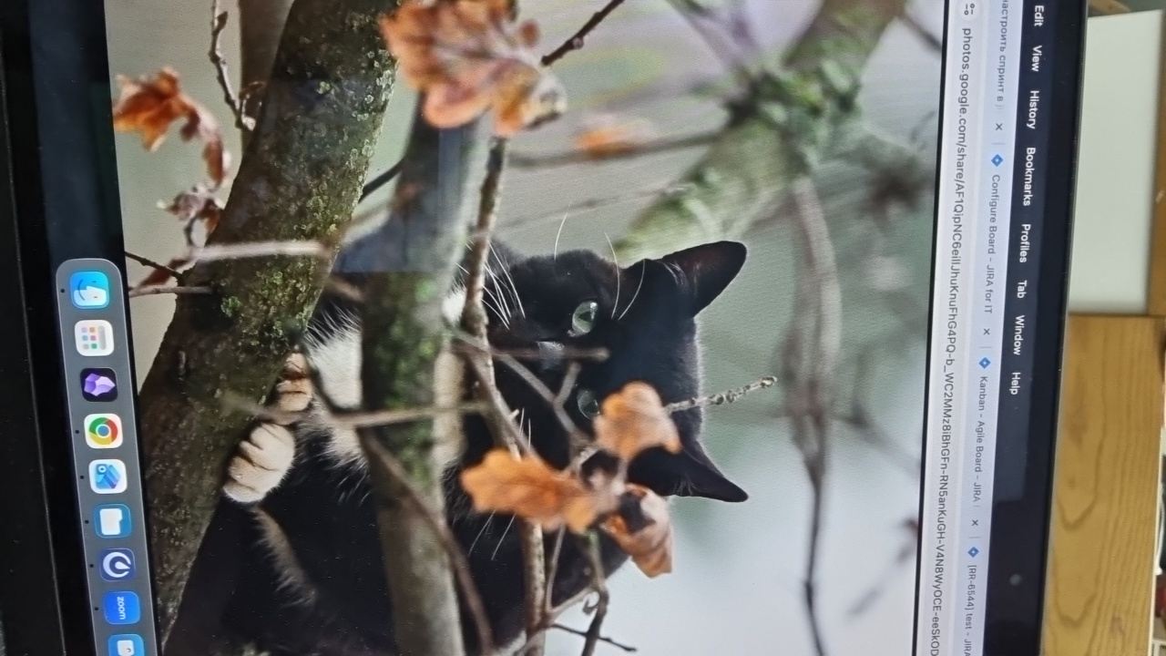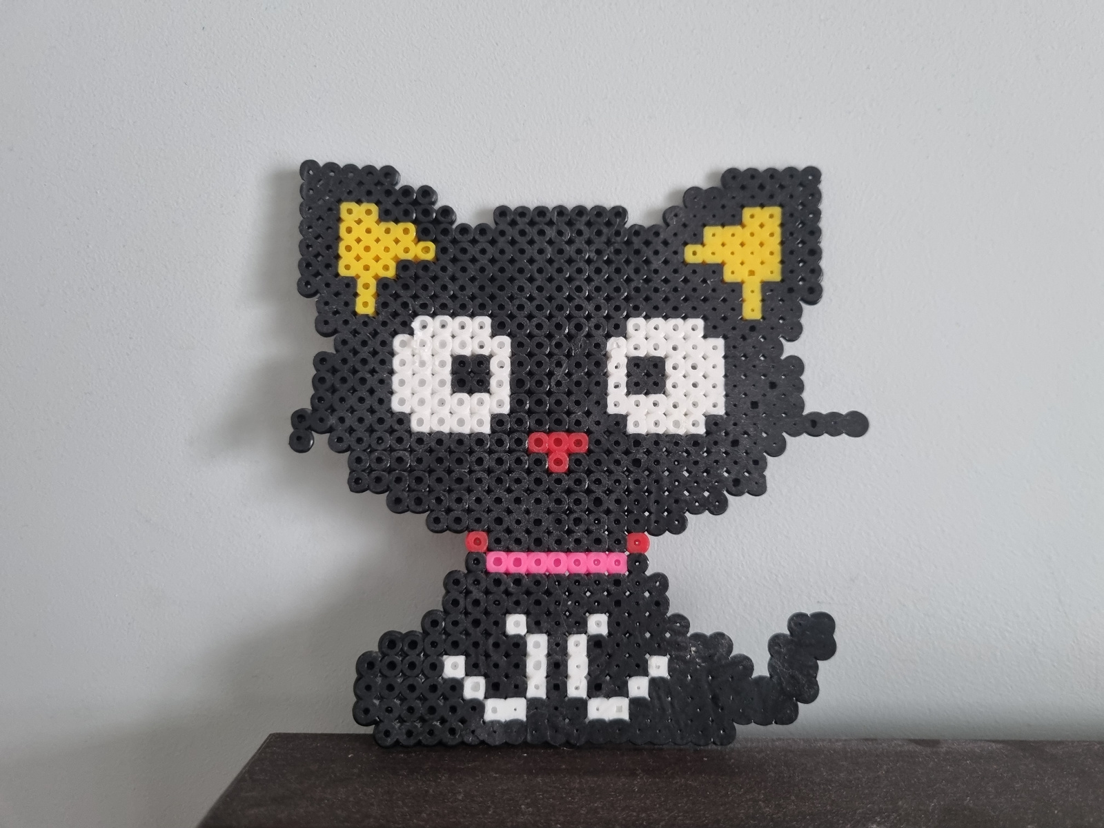 A black cat figurine made of fuse beads rests on a dark brown surface, possibly a table or shelf, in front of a light gray wall. The cat features white eyes, a pink nose and collar, yellow ear marking…read more
