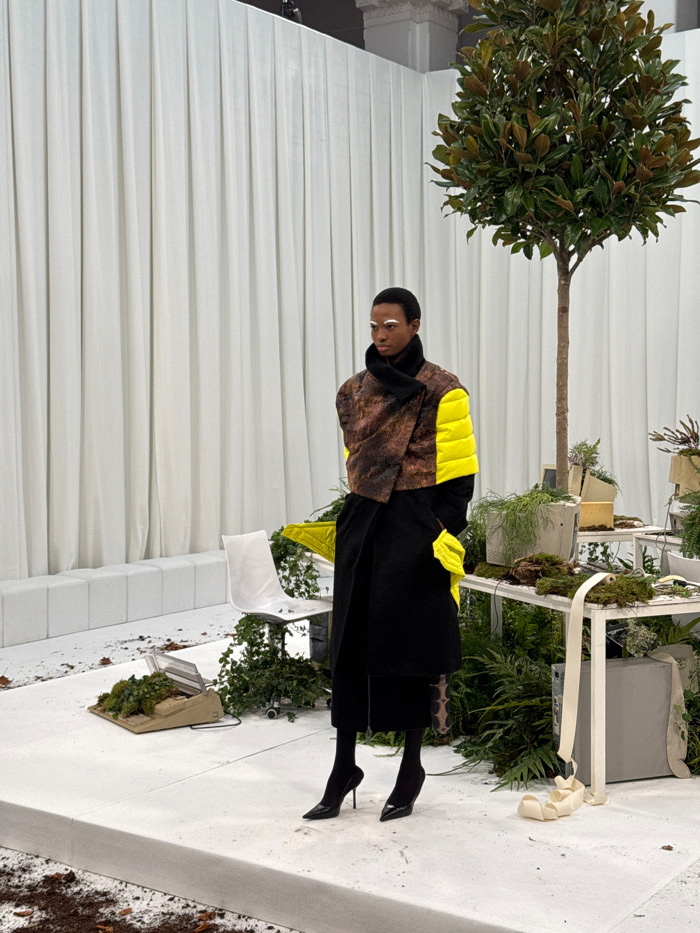 An interior scene, likely a fashion presentation, takes place within a building featuring classical architectural elements (fluted pilaster, cornice) in Milan, Italy. A single Black individual, presenβ¦read more