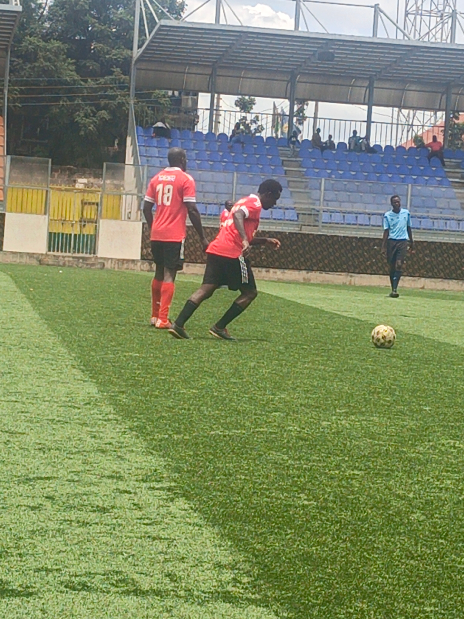 Two soccer players, one wearing a red jersey with the number 18 on the back, are on a green soccer field. One player is standing, and the other is running toward a soccer ball. A referee in a blue uni…read more