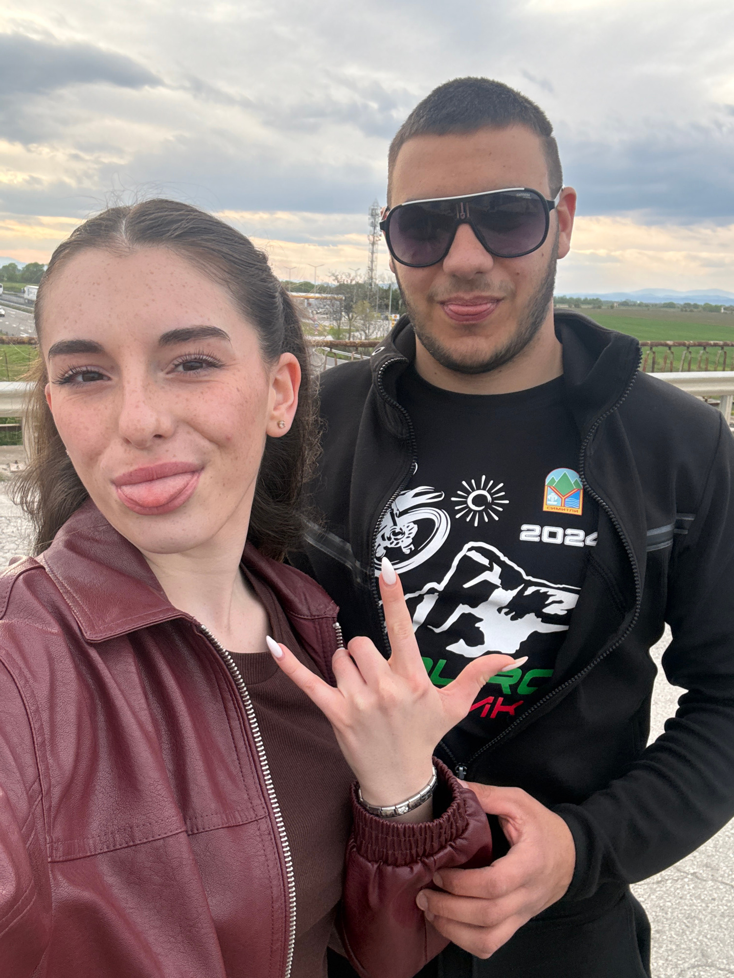 Two individuals are posing for a selfie outdoors. The person on the top is a man wearing sunglasses and a black hooded jacket with a black t-shirt underneath featuring graphics of a mountain, sun, and…read more