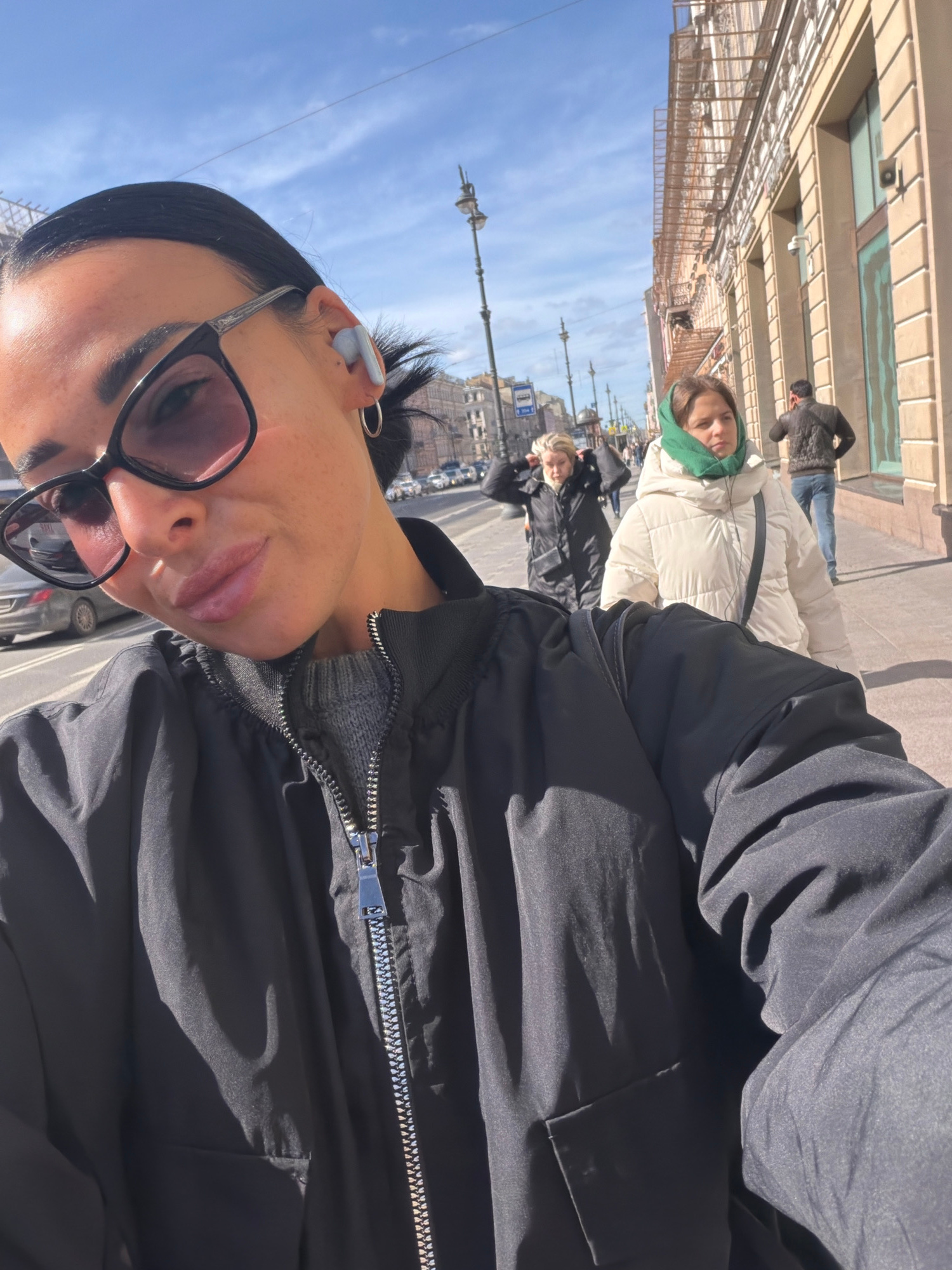 A selfie image was taken on a sunny day in Saint Petersburg, Russia. The picture includes a woman wearing sunglasses and an earpiece. She is wearing a black jacket. Behind her are other people walking…read more