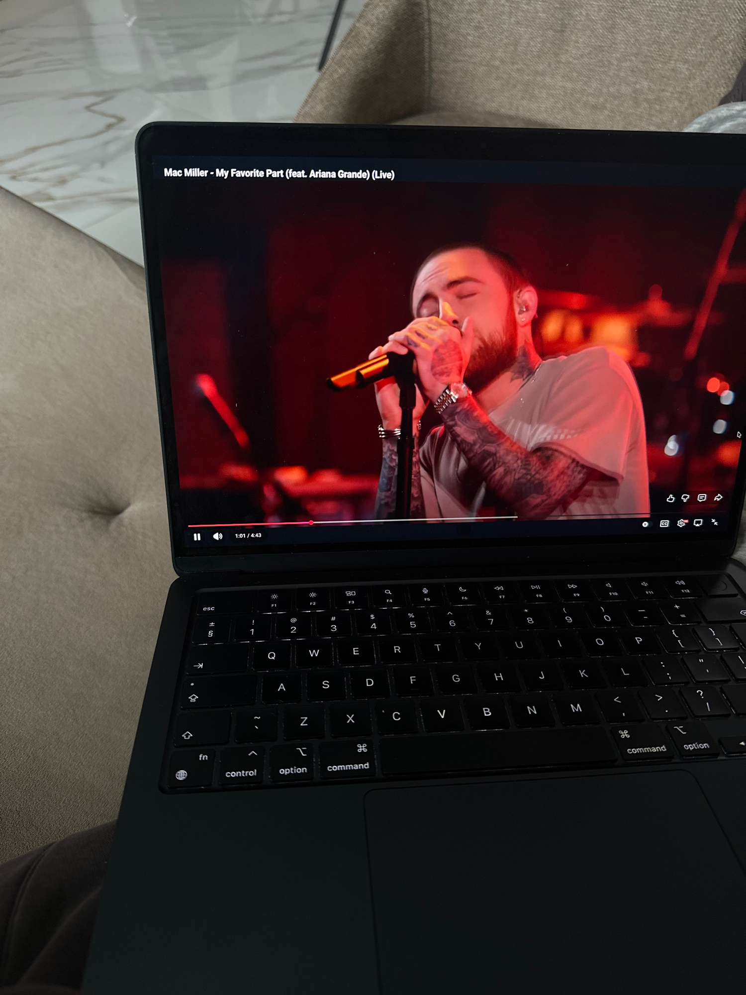 The image shows a laptop with a screen displaying a live performance of Mac Miller's "My Favorite Part" (featuring Ariana Grande). The laptop is black with a visible keyboard. The environment surround…read more