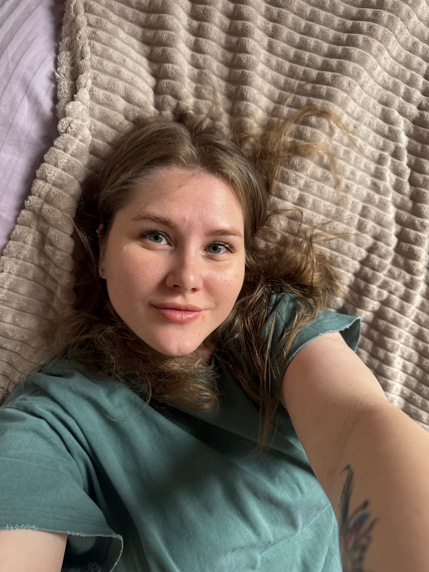 A person is lying on a bed. The person has fair skin, light brown hair, and is wearing a green shirt. A portion of the person's arm with a tattoo is visible. The bed has a textured brown blanket and a…read more