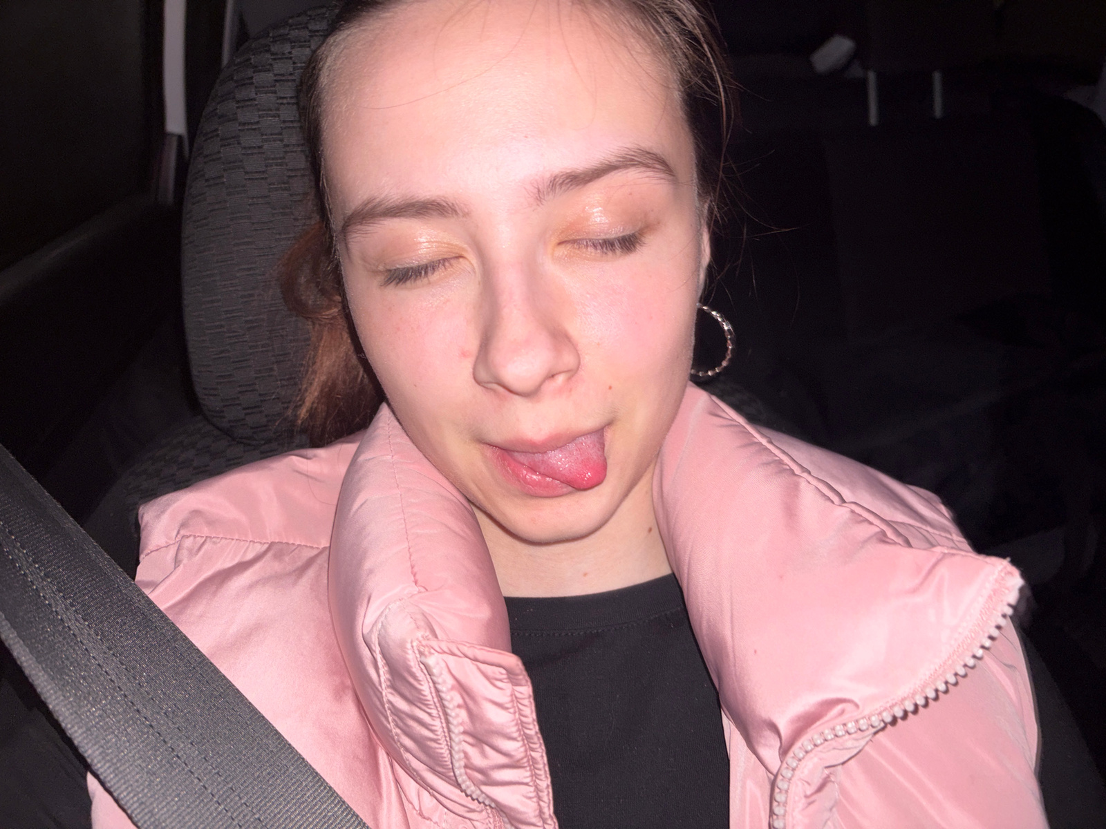 The image features a close-up portrait of a young person, likely female, situated inside a vehicle. She is wearing a light pink puffy jacket with a visible zipper, layered over a black top. Her head i…read more