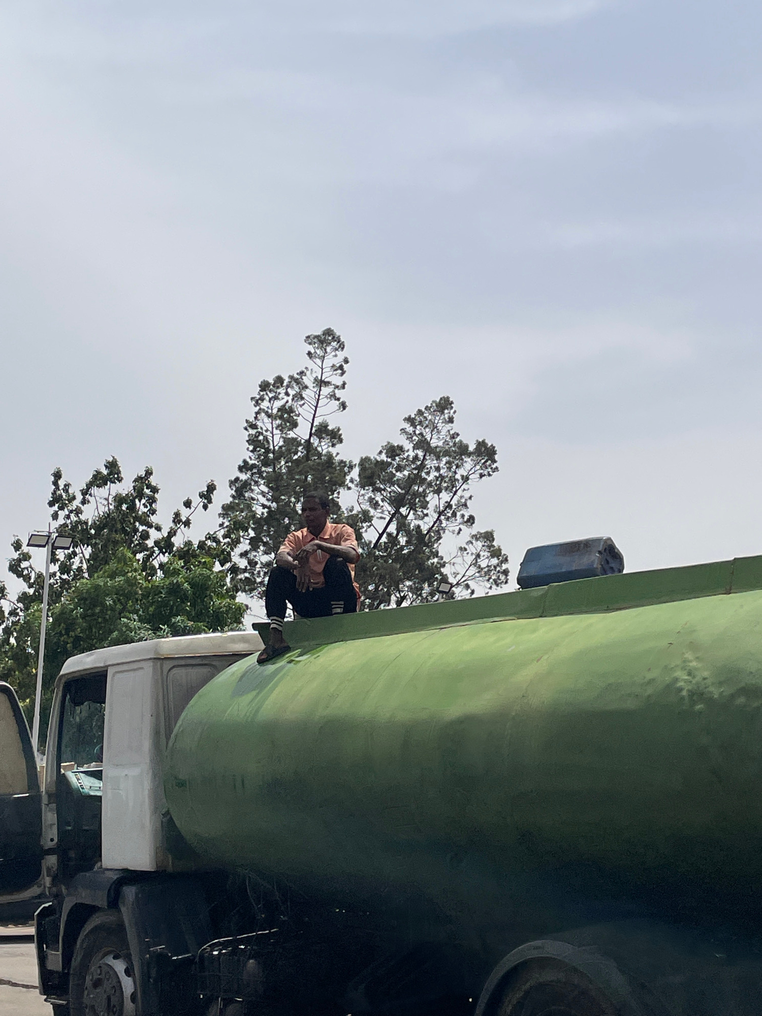 A man sits atop a large, green tanker truck. The truck is parked near trees. The sky is overcast. The location is Jos, Nigeria.