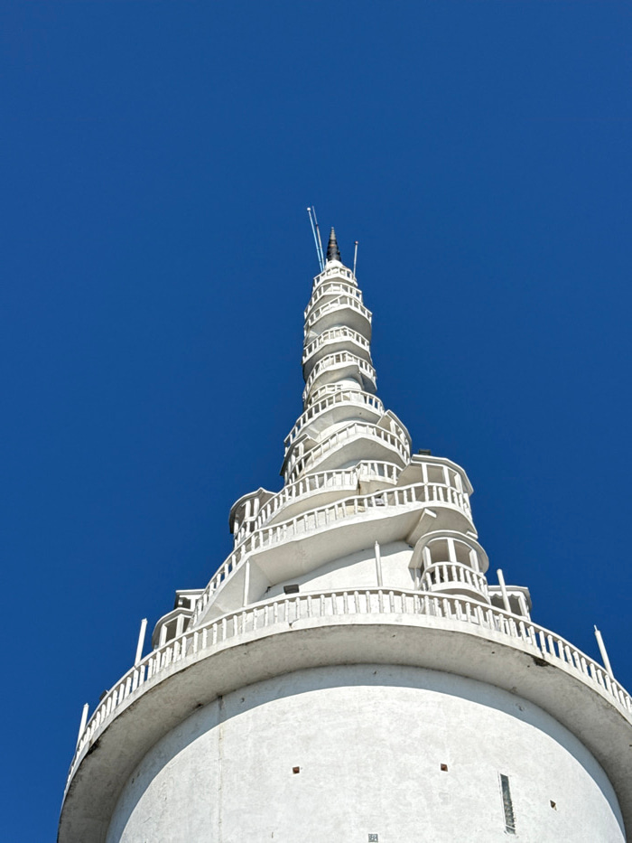 An upward perspective showcases a stark white, spiraling tower against a clear, deep blue sky. The structure's design features repetitive circular levels decreasing in size towards the top, resembling…read more