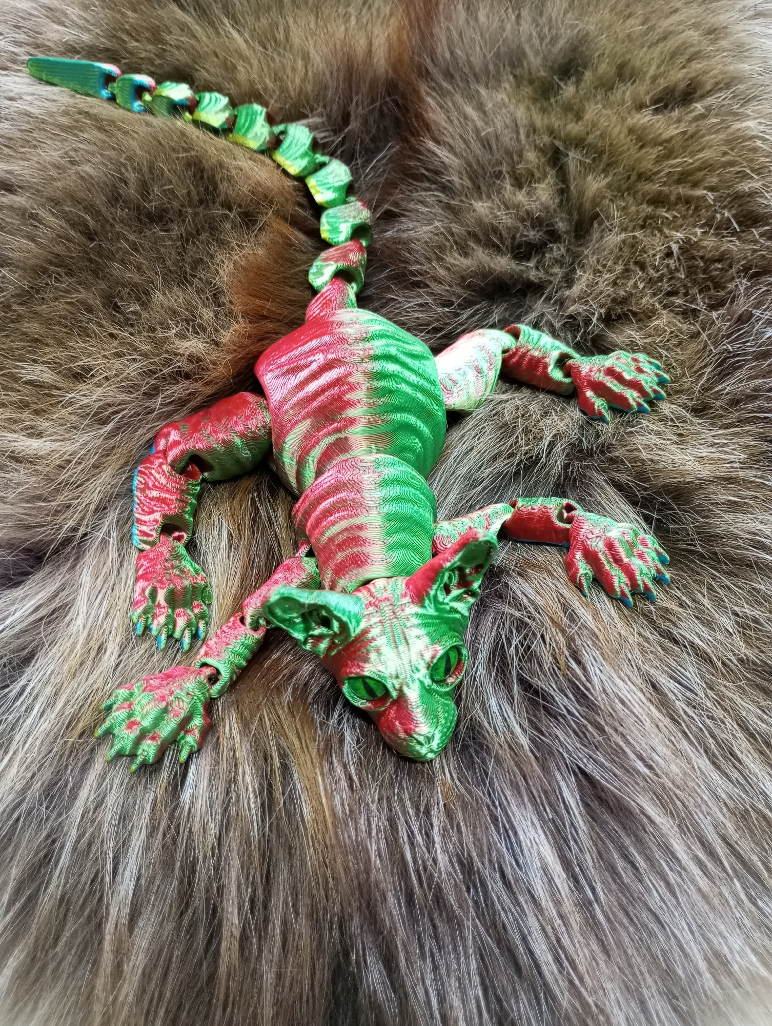 A 3D-printed, flexible toy depicting a creature resembling a cat-lizard hybrid is resting on a brown, furry surface. The toy is multicolored, primarily green and red, with articulated limbs and a segm…read more