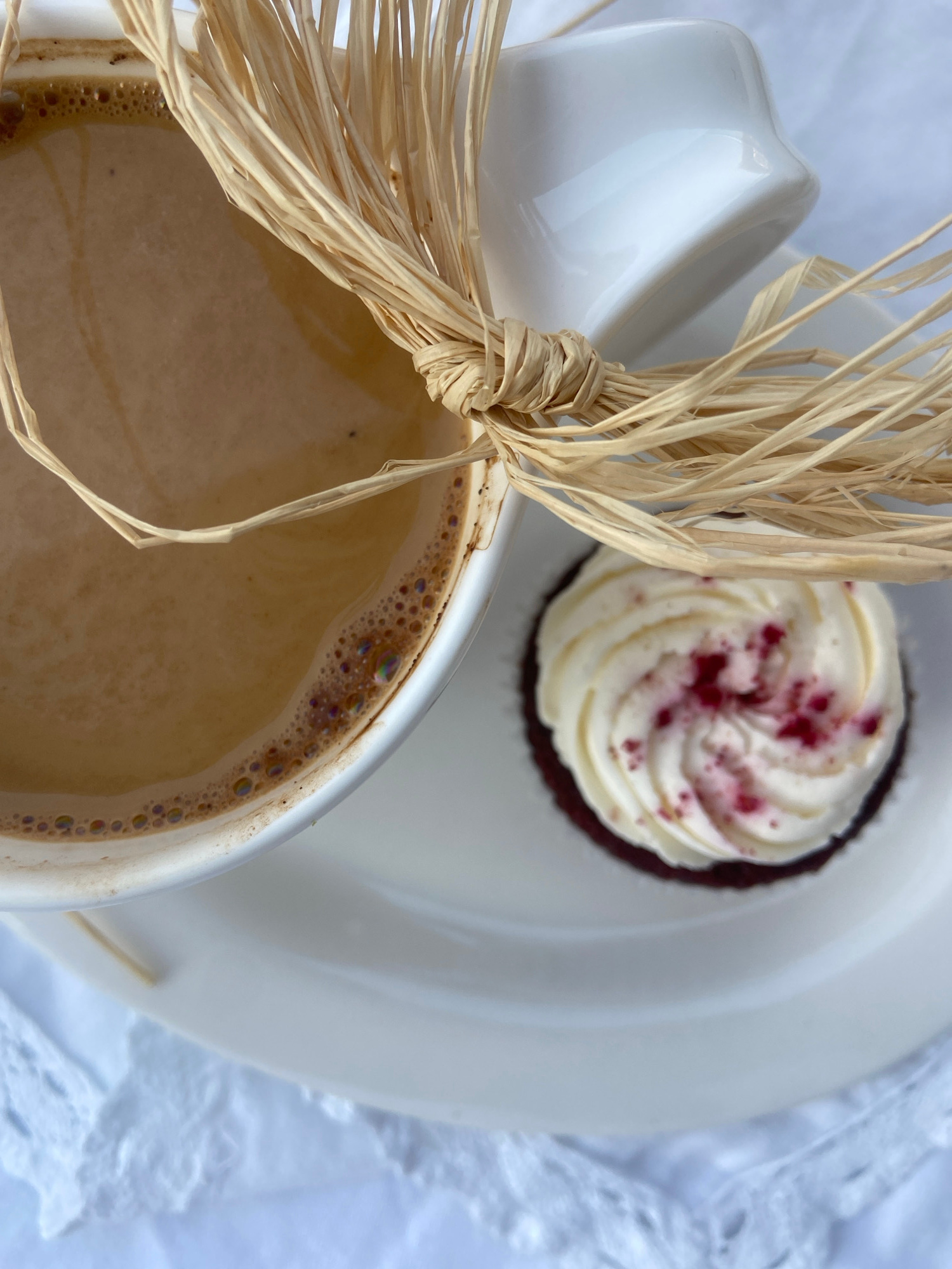 A top-down, close-up view captures a coffee cup, a cupcake on a white plate, and a bundle of dried straw. The coffee cup, filled with a light brown beverage and a rim of bubbles, occupies the bottom l…read more