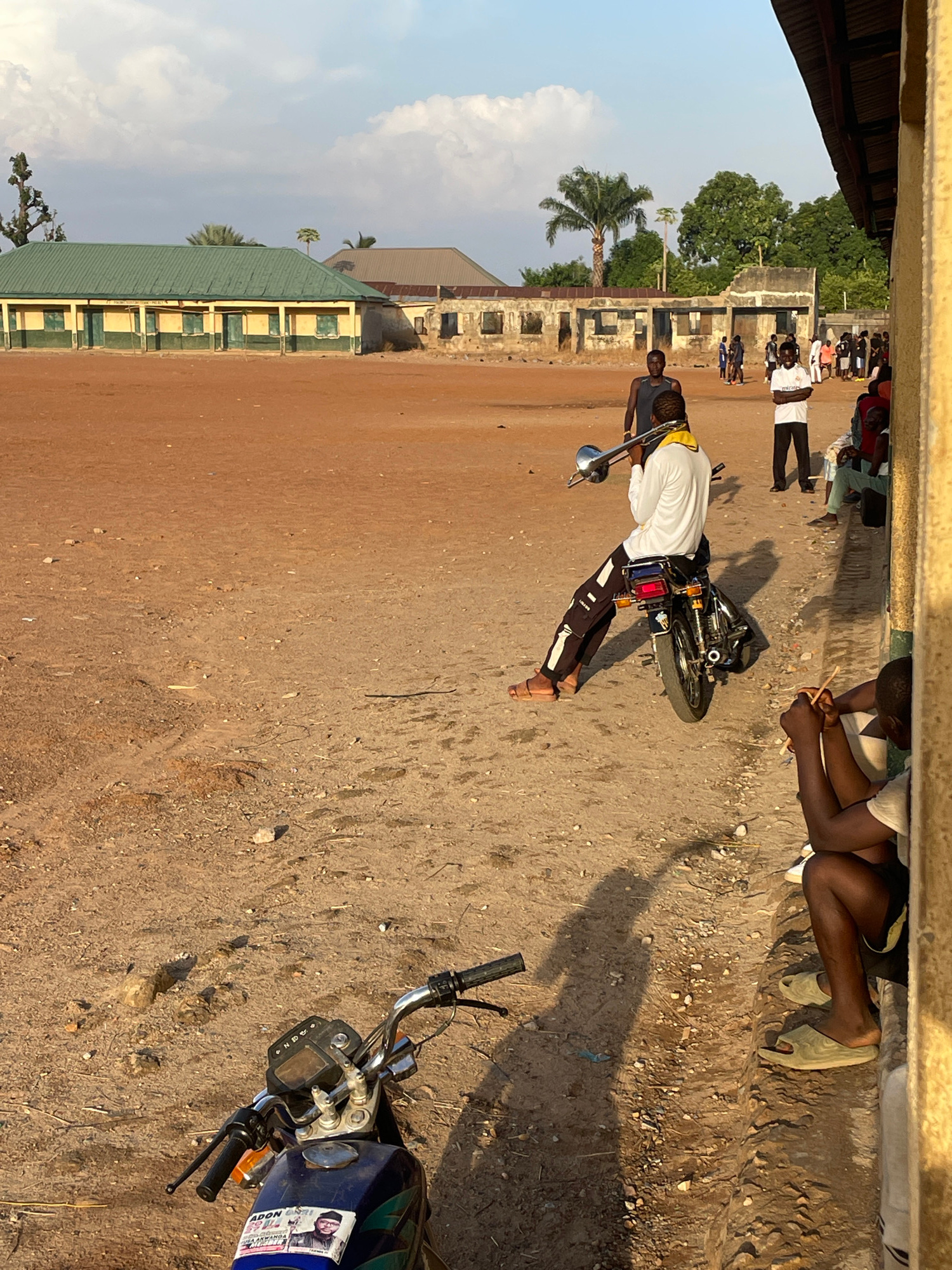 The image depicts an outdoor scene in Akwanga, Nigeria. The ground is dirt-covered. Several people are visible, including one individual in a white shirt and black pants holding a trombone while stand…read more