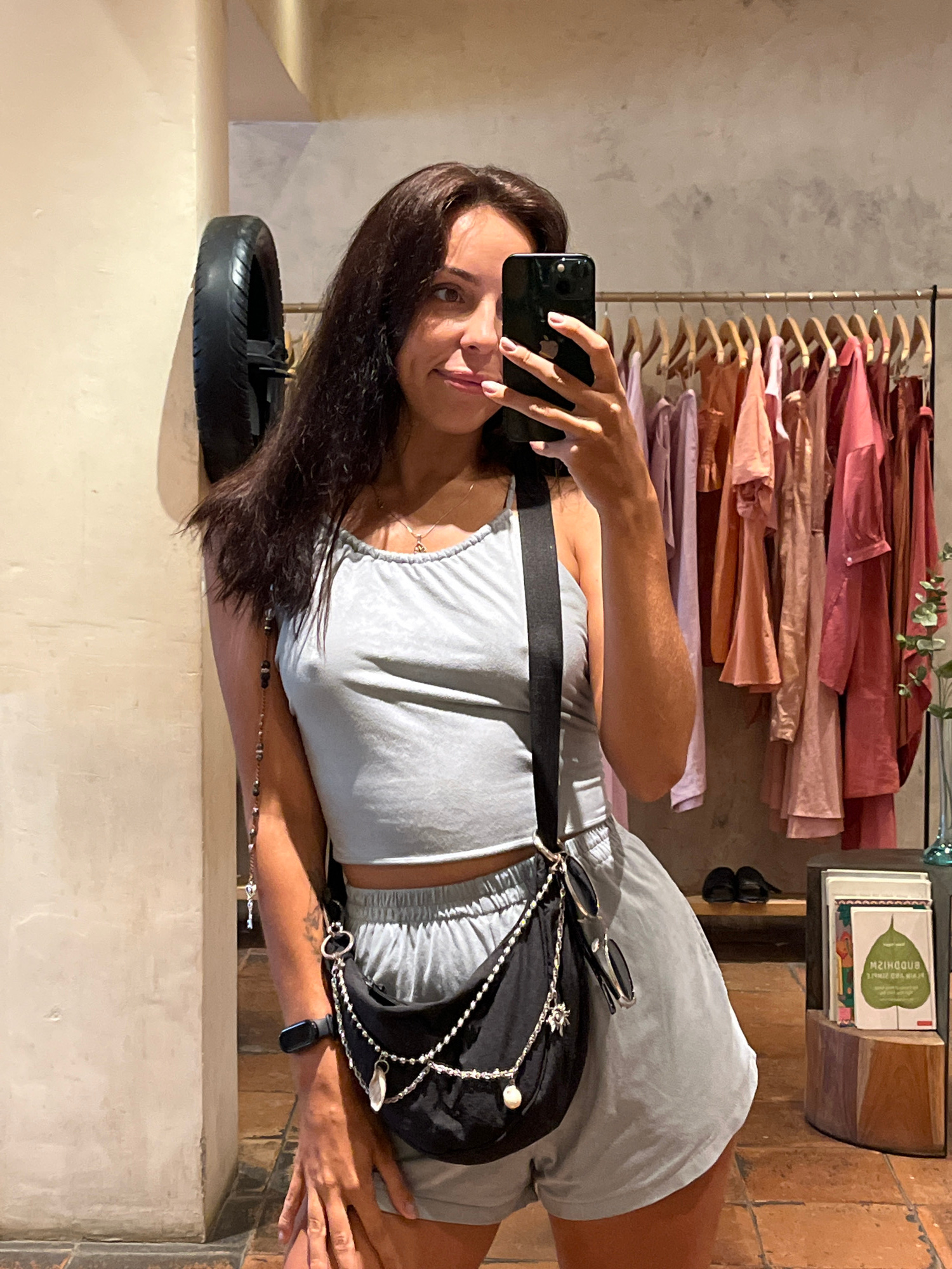 A woman is captured taking a mirror selfie indoors. The image shows her from the waist up, smiling faintly, with dark brown hair flowing over her shoulder. She is wearing a light grey two-piece outfit…read more