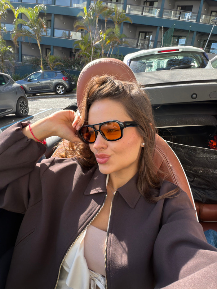 The image captures a close-up, upward-angled view of a young woman posing outdoors on a sunny day. The woman is in the foreground, looking directly towards the camera with a slight pout on her lips. S…read more