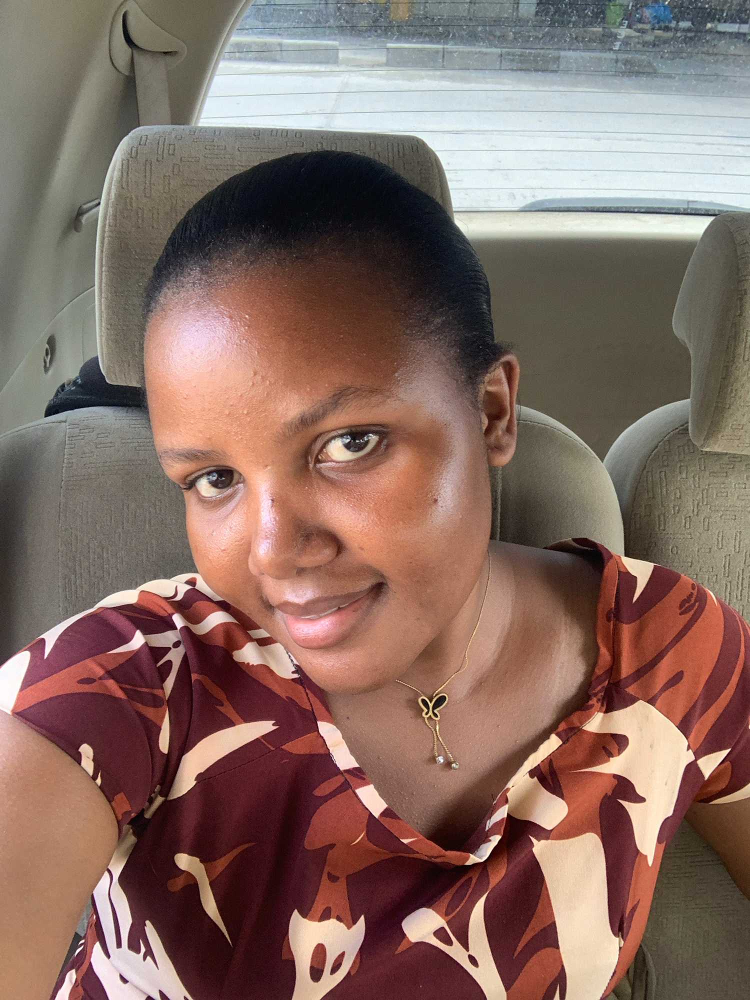 A dark-skinned woman with short black hair is sitting in a car. She is wearing a brown and beige patterned top and a gold necklace with a butterfly pendant. She is looking at the camera with a slight…read more
