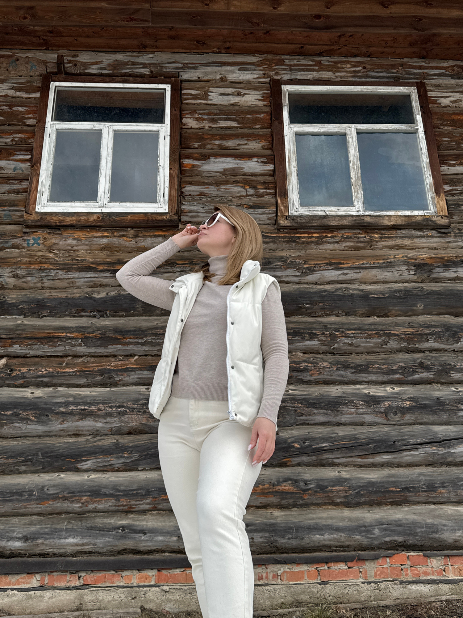 The image depicts a woman standing in front of a wooden building in what appears to be a rural area. The woman is wearing a light beige sweater, white pants, and a white vest. She is wearing sunglasseβ¦read more