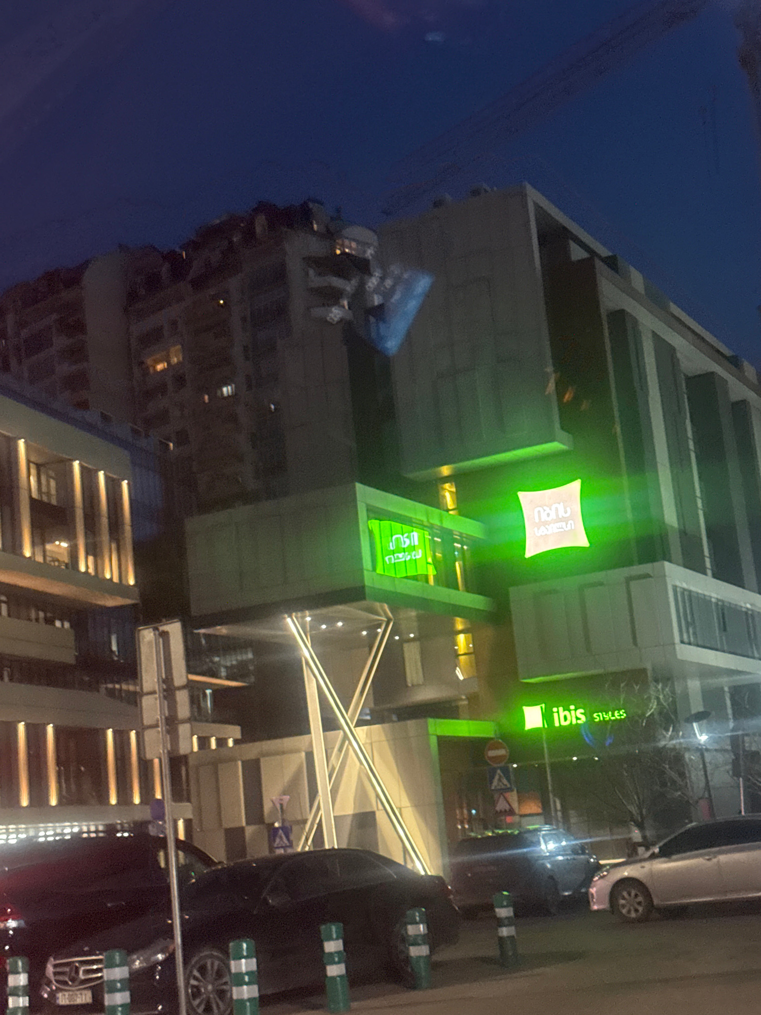 An exterior, nighttime, low-angle shot of a building in the city of Tbilisi, Georgia. The building features a well-lit "ibis Styles" sign. Adjacent to the hotel is a multi-story structure with illumin…read more