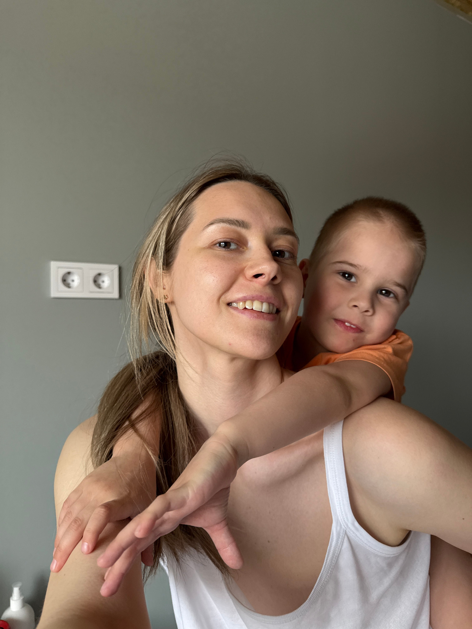 A woman with light brown hair and a white tank top is carrying a young boy with blond hair and an orange shirt on her back. Both are smiling at the camera. The woman is facing the camera, and the boy…read more