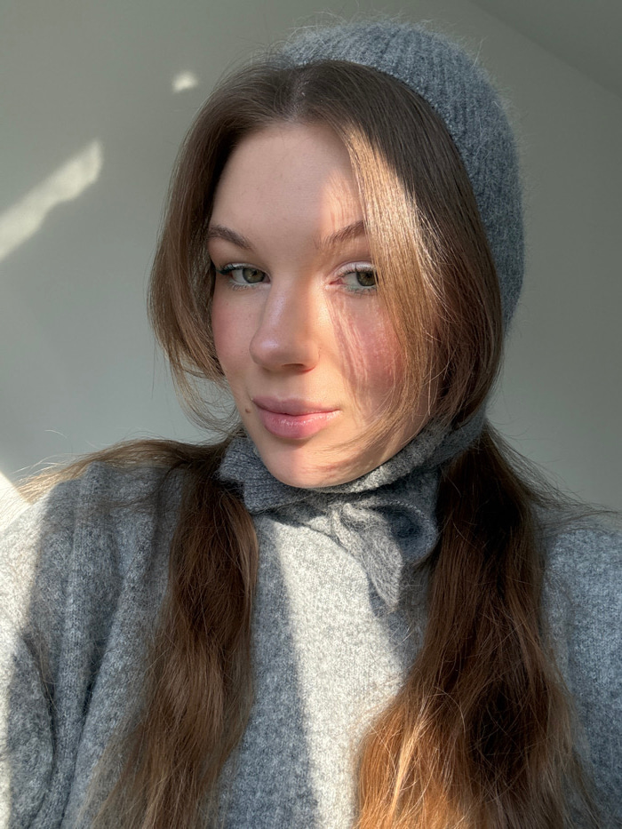 A close-up portrait features a young adult female positioned centrally, looking directly forward. She has long, straight brown hair, styled with some strands framing her face. She is wearing a grey kn…read more