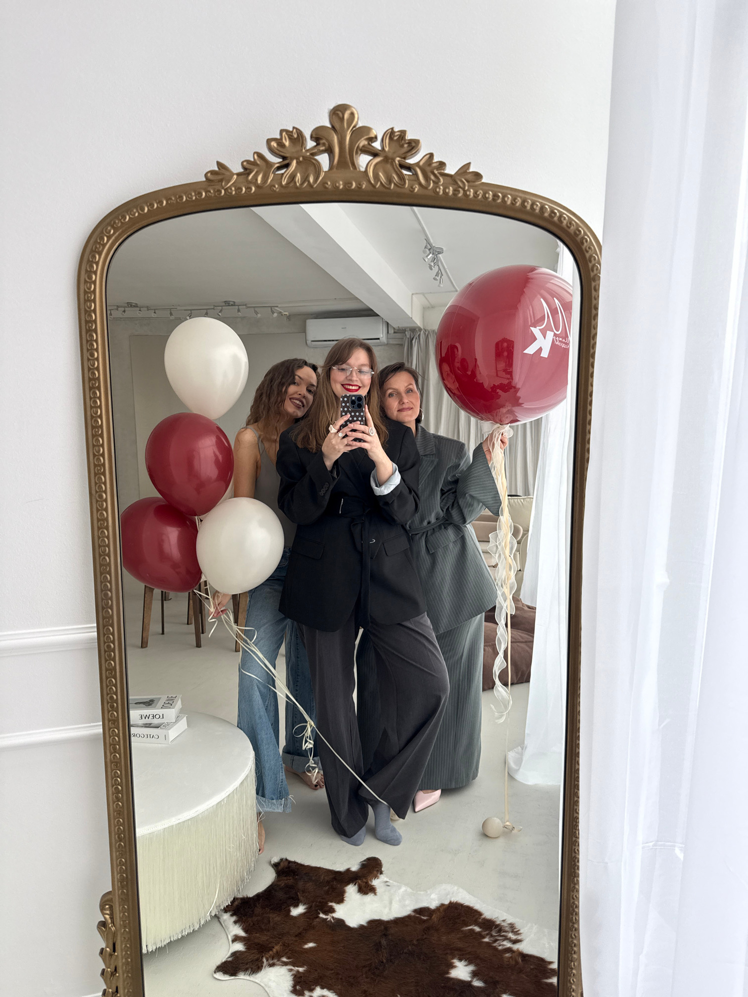 The image shows a reflection in an ornate, gold-framed mirror. Three women are taking a selfie. Two red balloons and two white balloons are visible in the mirror. Behind the women, the reflection show…read more