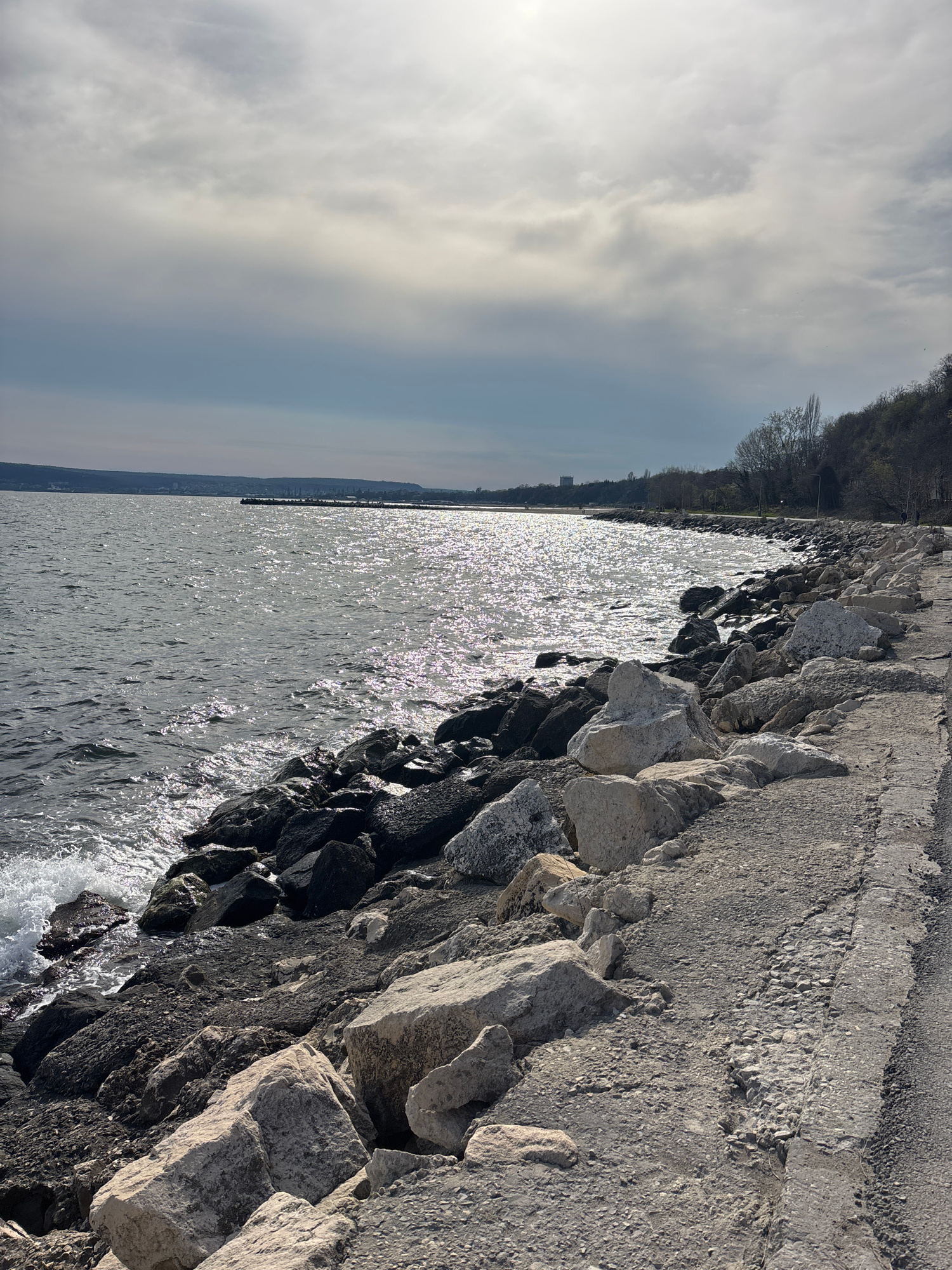This image captures a view of the Black Sea from the coastline in Varna, Bulgaria. A rocky embankment dominates the right foreground, transitioning from concrete pathway to large, gray and black bould…read more