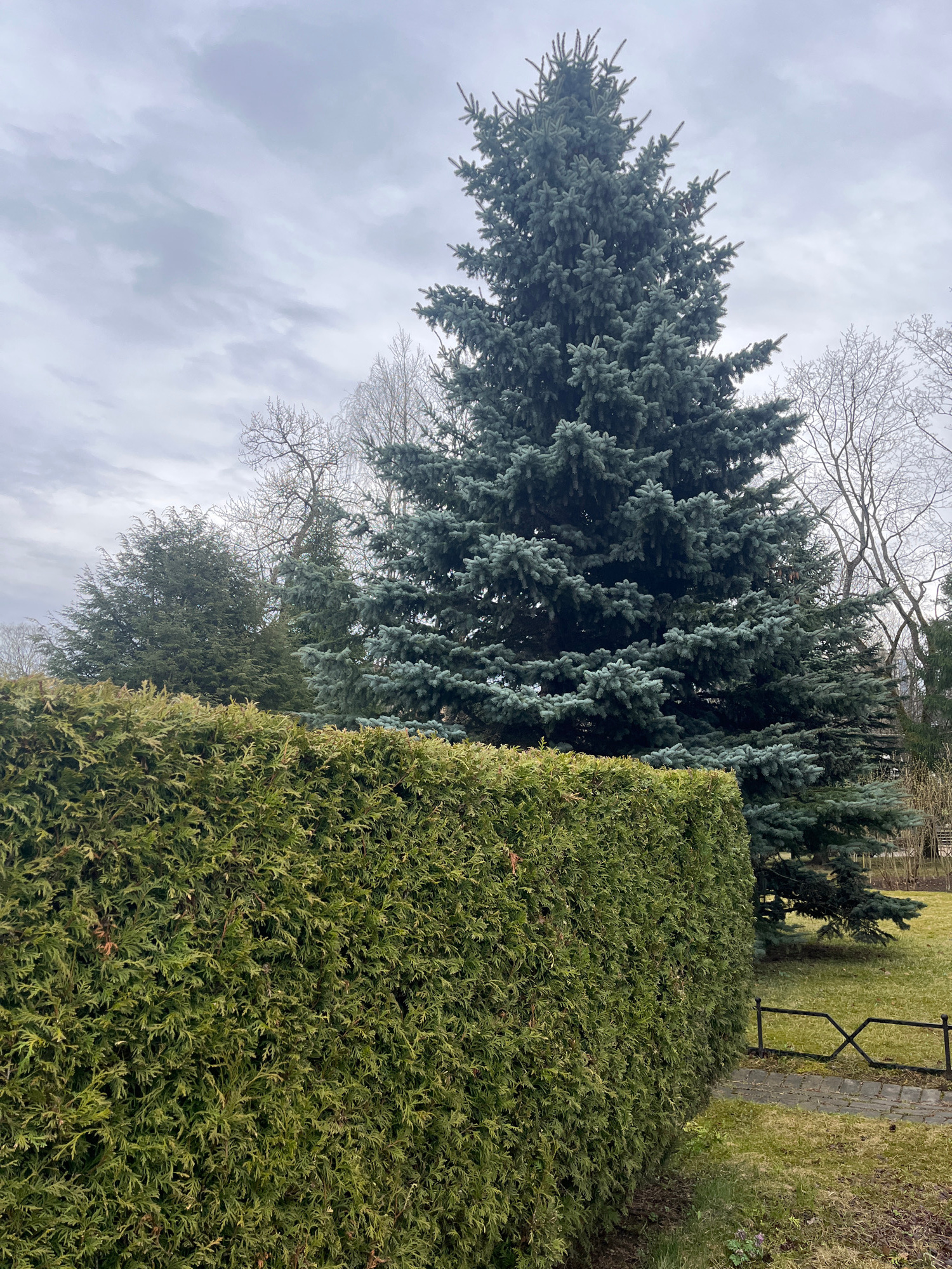 The image depicts a cloudy outdoor scene, likely in a park or garden. A tall, blue-green spruce tree dominates the left side of the frame. To the right, a dense, trimmed green hedge is visible. In the…read more