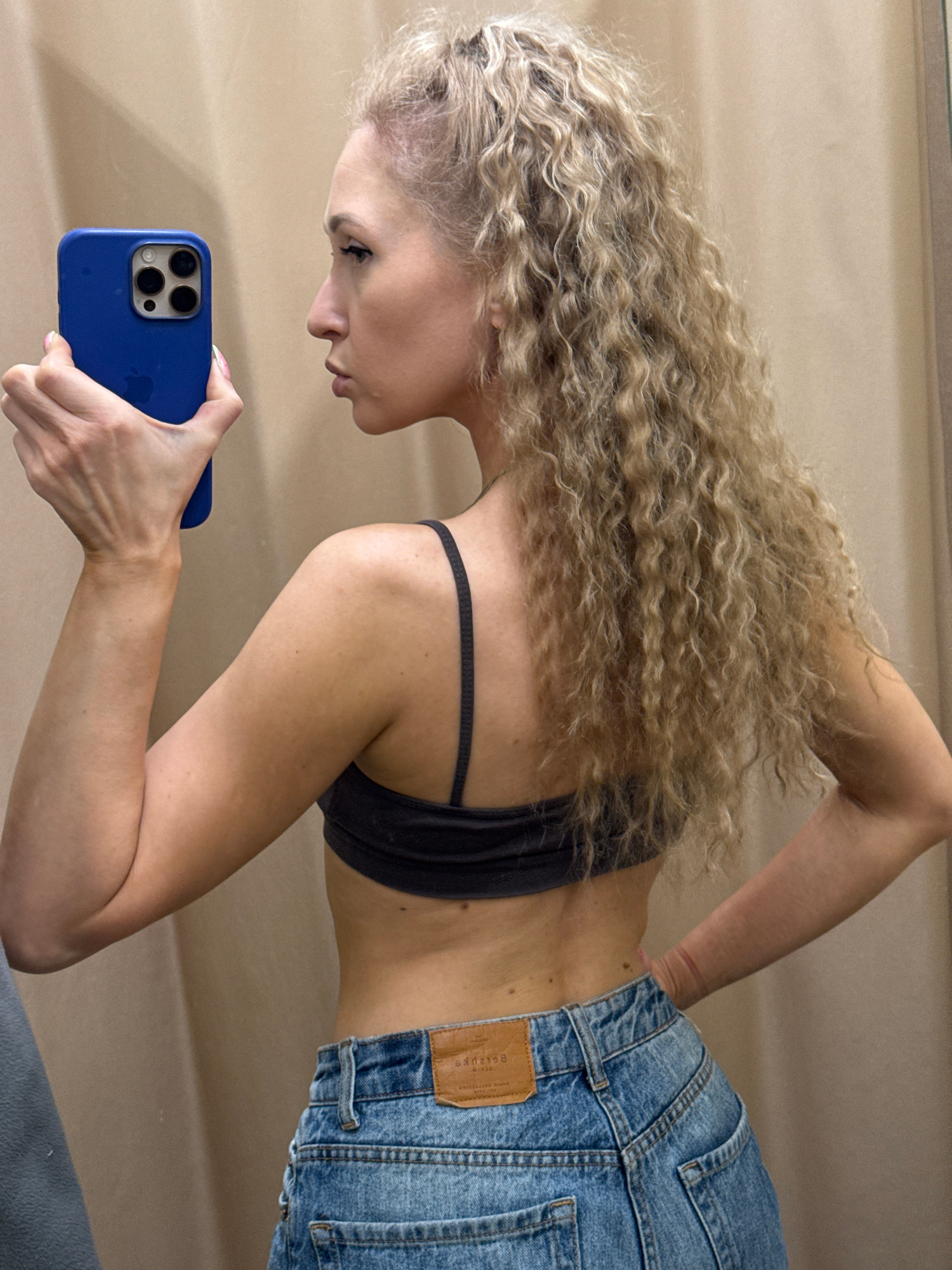 A young woman is reflected in a mirror while taking a selfie. She is wearing blue jeans and a black bra. Her long, curly hair is blonde. The woman is holding a blue smartphone in her right hand. The b…read more