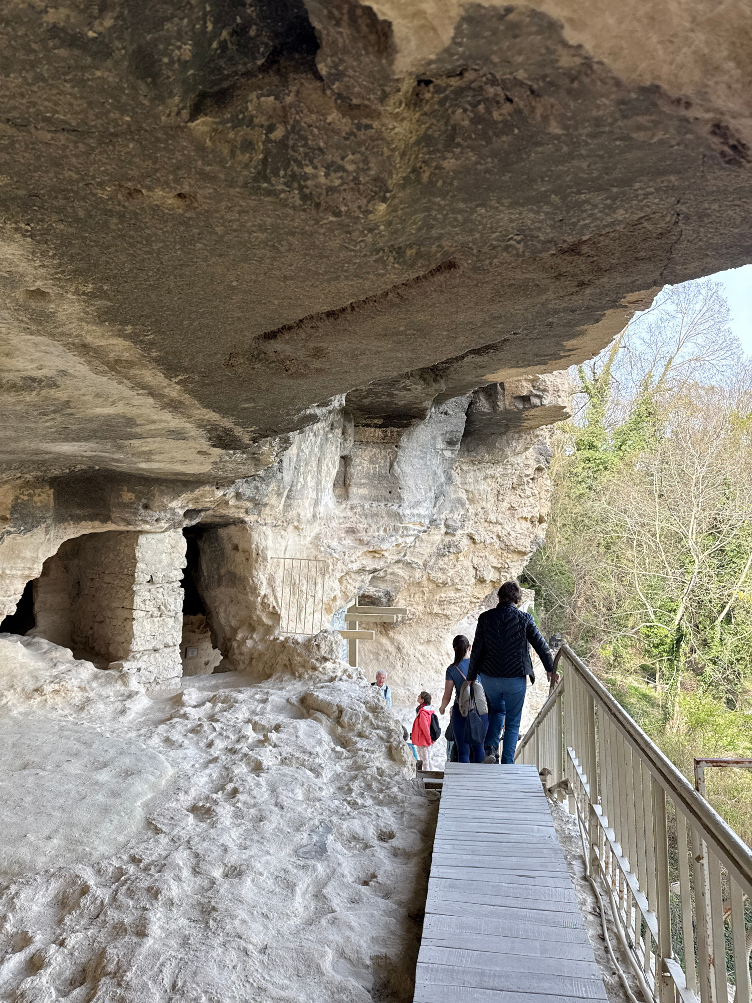 This media file captures an outdoor scene at a historical rock-hewn site, likely the Aladzha Monastery near Varna, Bulgaria. The primary subjects are the ancient rock formations, which feature multipl…read more
