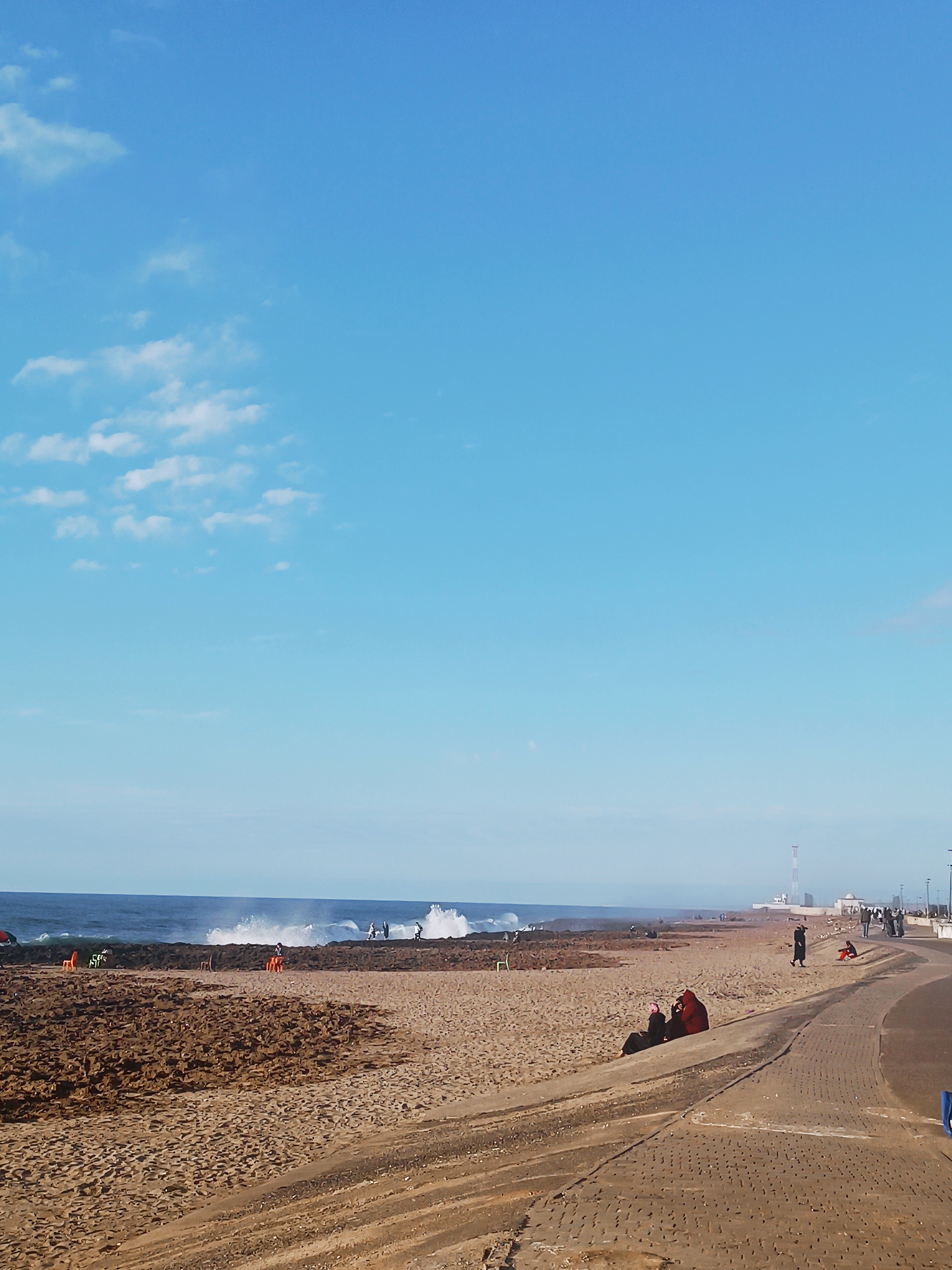 The image depicts a beach scene in Salé, Morocco. A wide sandy beach is divided into two sections: one with rocks and the other with smooth sand. Several individuals are scattered across the beach and…read more