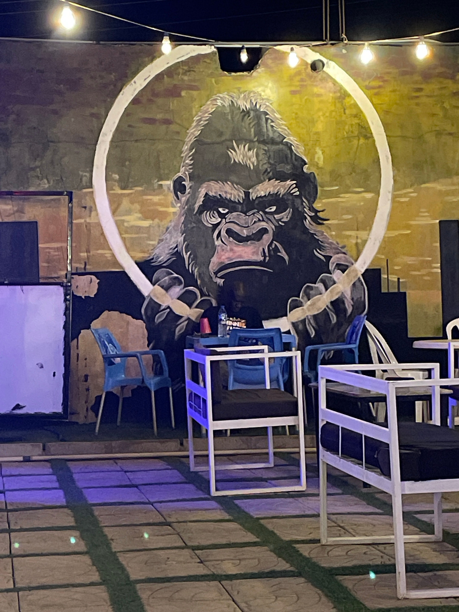 The image depicts a mural of a gorilla head with a white halo-like circle around it, located in Jos, Nigeria. The mural is painted on a textured wall with varying shades of green, brown, and black. A…read more