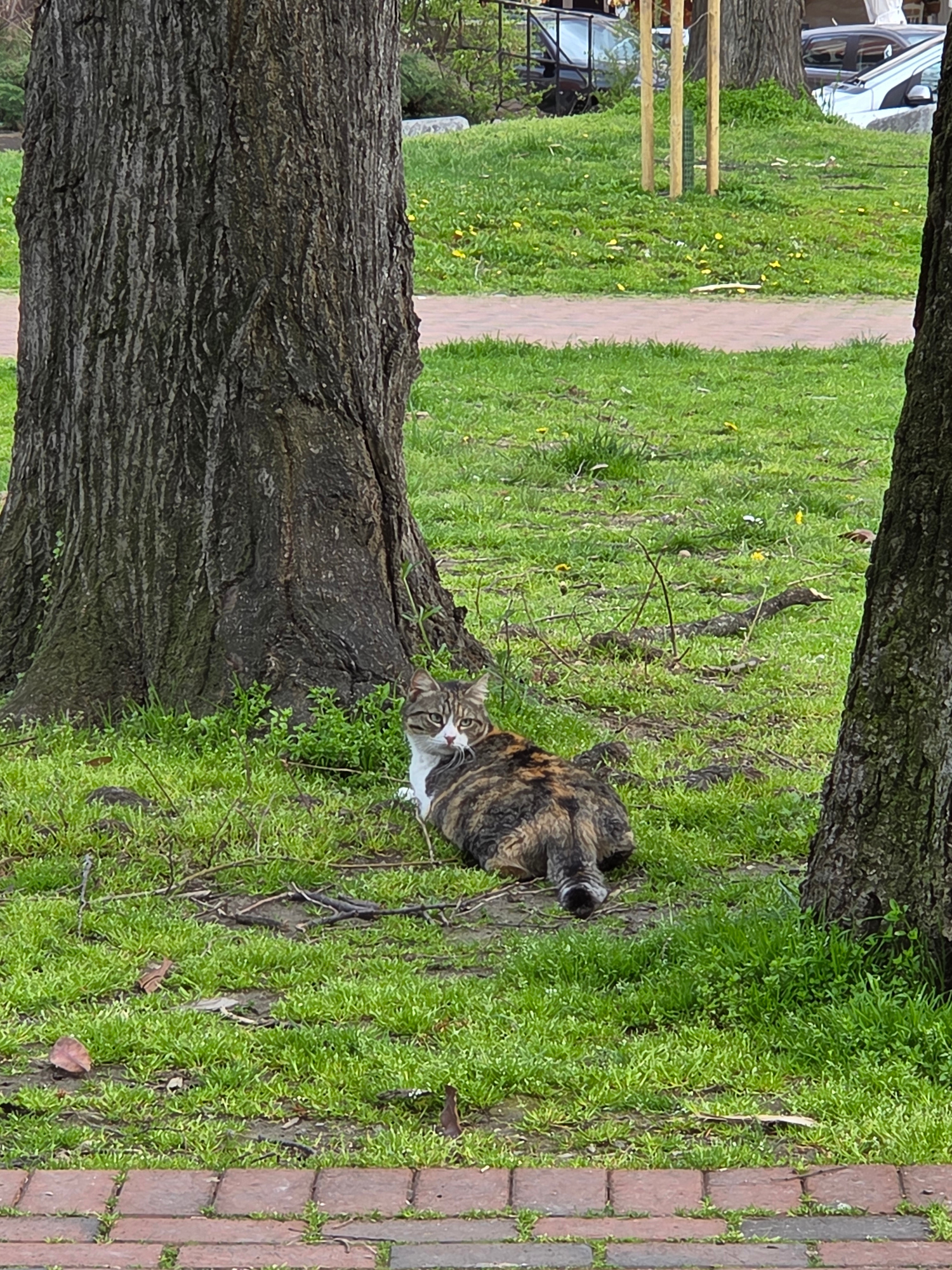 The image shows a cat near the base of a tree. The cat is striped with a white chest. The tree has rough bark. The ground is covered in green vegetation and some dead leaves. A brick path runs along t…read more