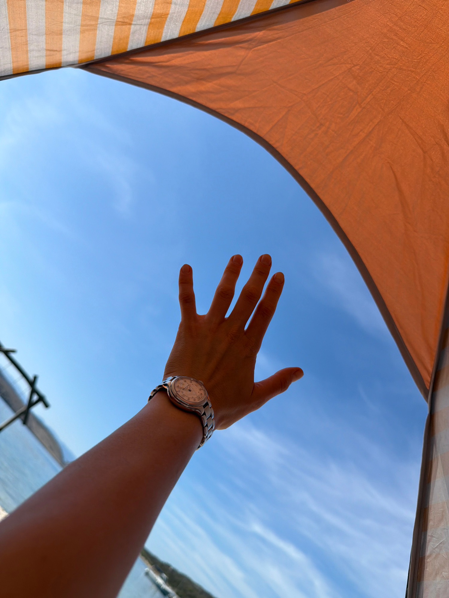 The image shows a view from underneath a beach tent, looking up at a blue sky with a few wispy clouds. A person's arm and hand are outstretched towards the sky, with a silver wristwatch visible on the…read more