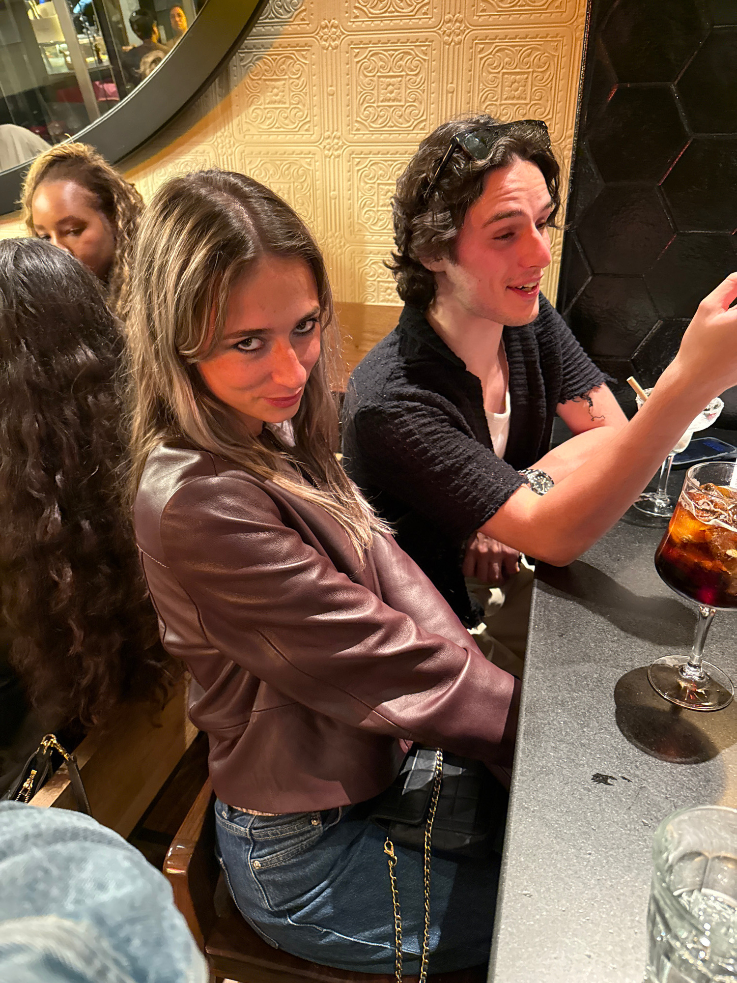 Three people are seated at a table in an indoor establishment. A woman with highlighted brown hair wearing a brown leather jacket and jeans is seated facing the camera. To her right, a man with curly…read more