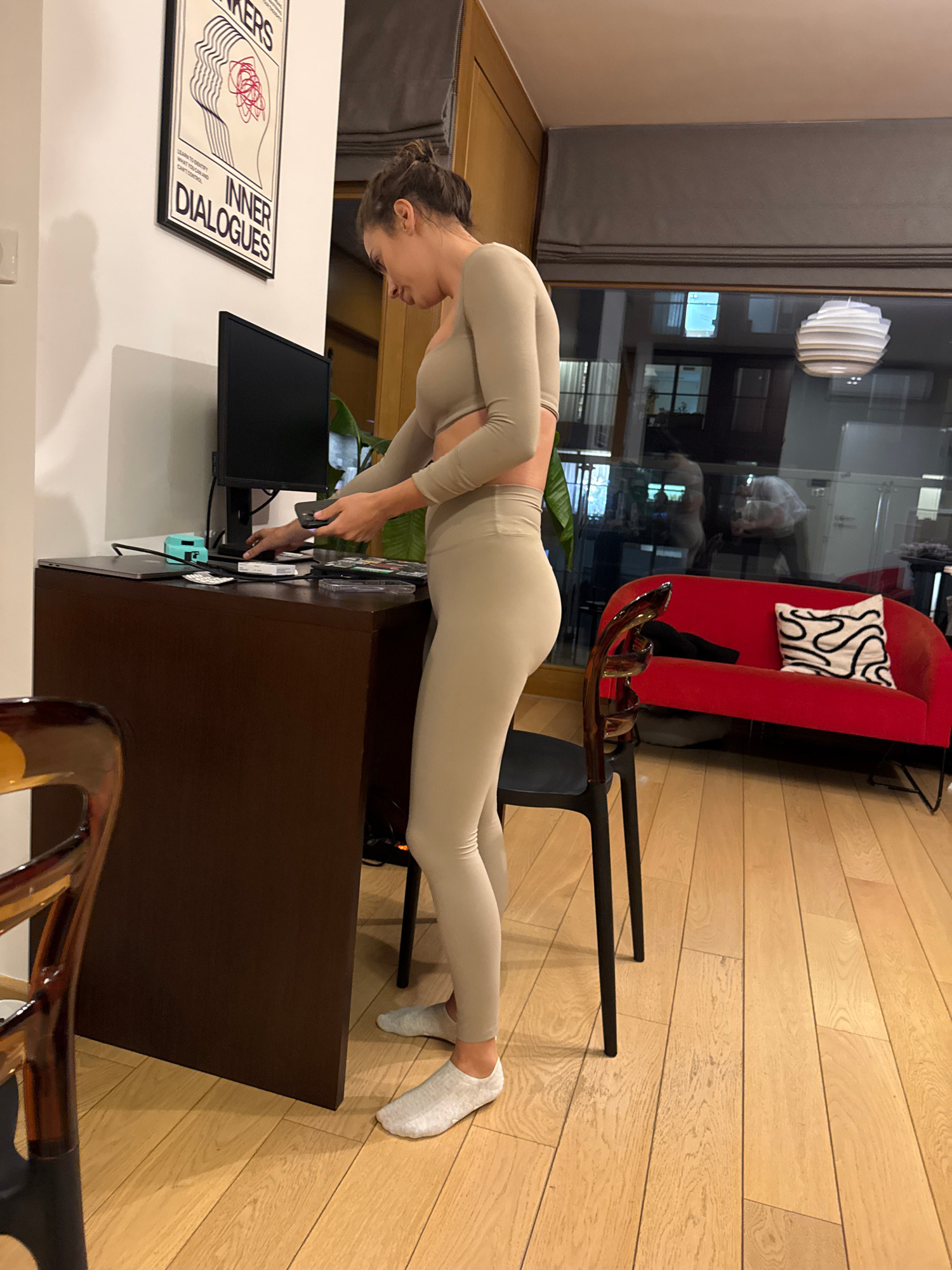 A woman in a light beige athletic outfit is performing a modified plank with her forearms resting on the edge of a dark brown desk. She is facing towards the desk and looking down at it. She is wearin…read more