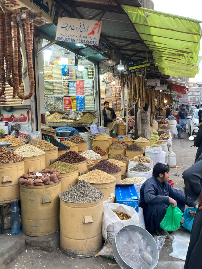 This image captures an outdoor market scene in Quetta City Tehsil, Pakistan. The view focuses on a series of stalls selling dried fruits, nuts, and spices. In the foreground and midground, numerous l…read more