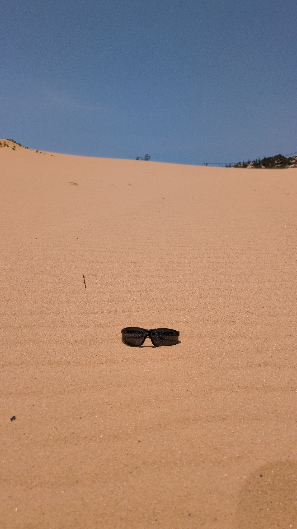 The scene is on a sandy beach in Phuoc Dinh, Vietnam. The sky is blue, and the sand is light brown. There is vegetation along the edge of the sand, on the left-hand side. A pair of dark-colored sungla…read more
