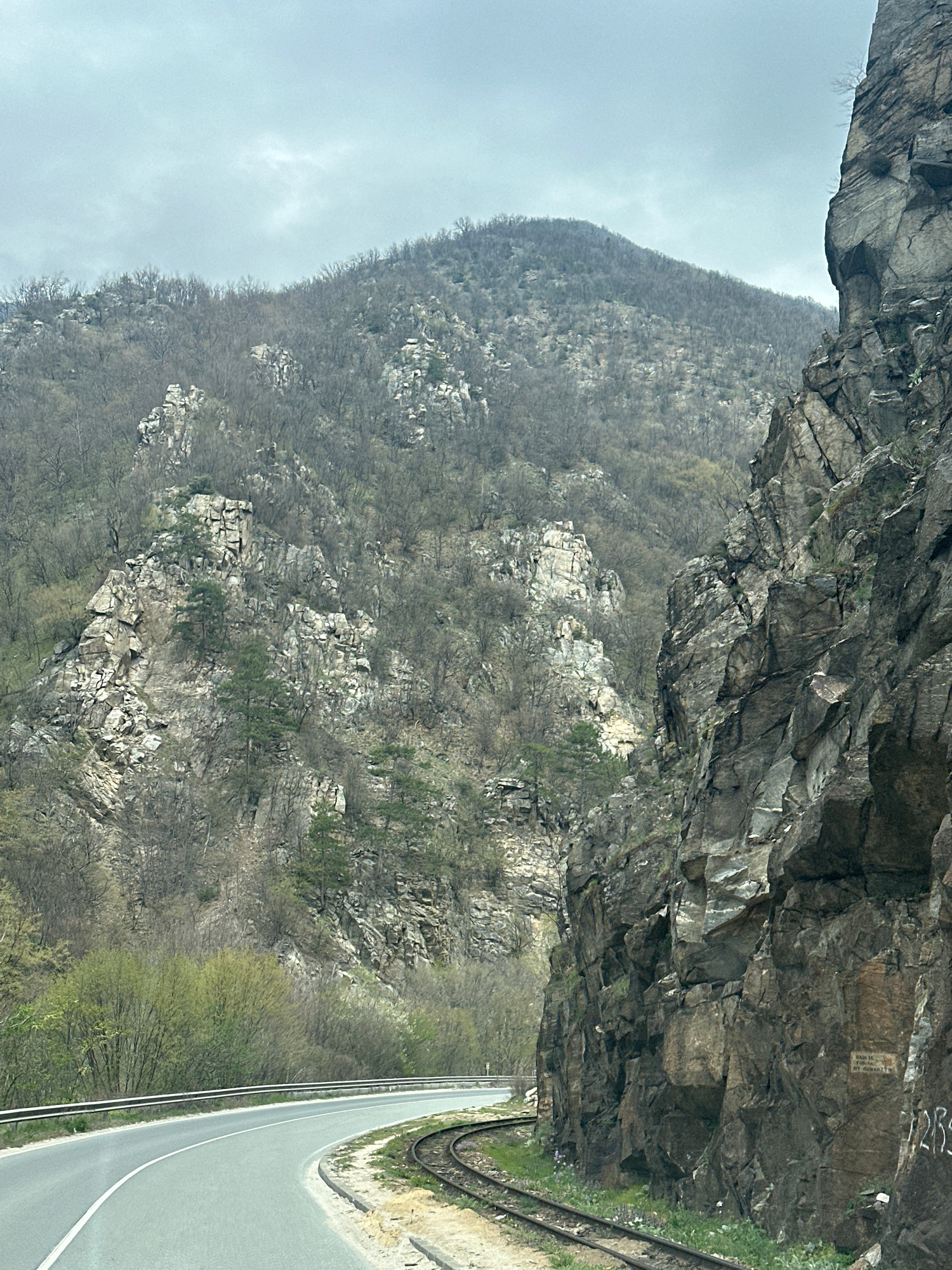 The image depicts a mountain road and a railway track running parallel to each other. A sheer rock face looms over the road and railway on the right. The mountain is covered with sparse vegetation. Th…read more