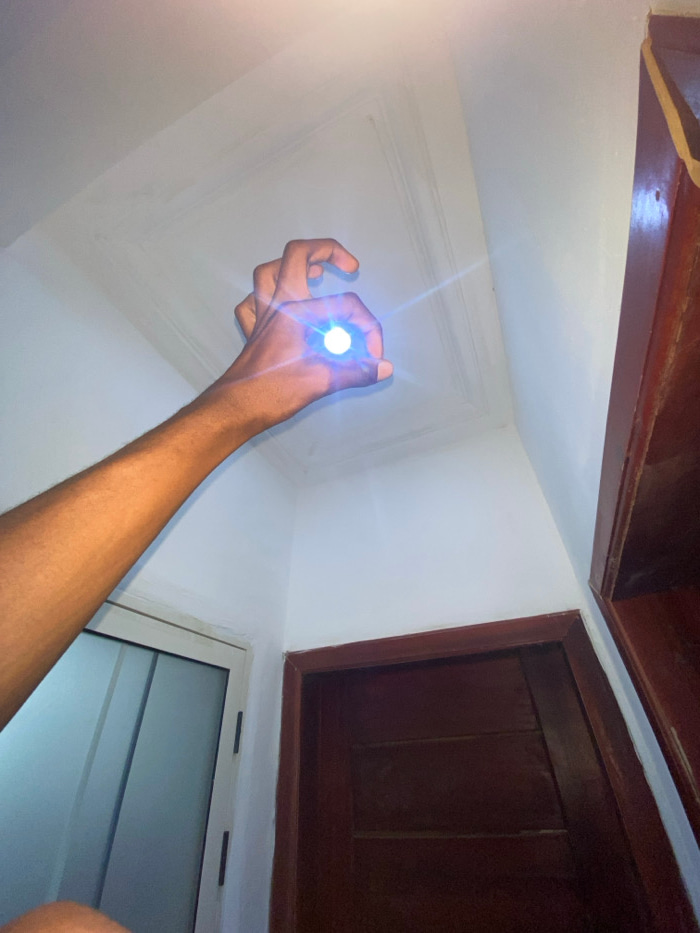 The image displays an indoor scene in Joma, Ghana, captured from a low angle. A dark-skinned forearm and hand extend from the lower left towards the upper center, holding a small, spherical object emi…read more