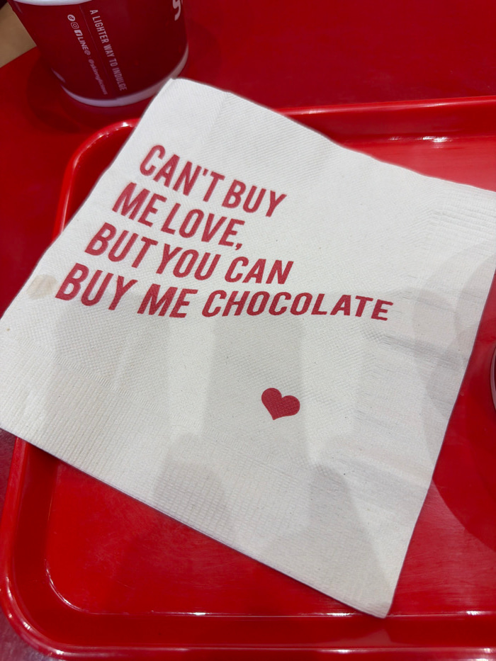 A white paper napkin, featuring the red text "CAN'T BUY ME LOVE, BUT YOU CAN BUY ME CHOCOLATE" and a small red heart, rests on a glossy red plastic tray. A red paper cup is partially visible in the up…read more