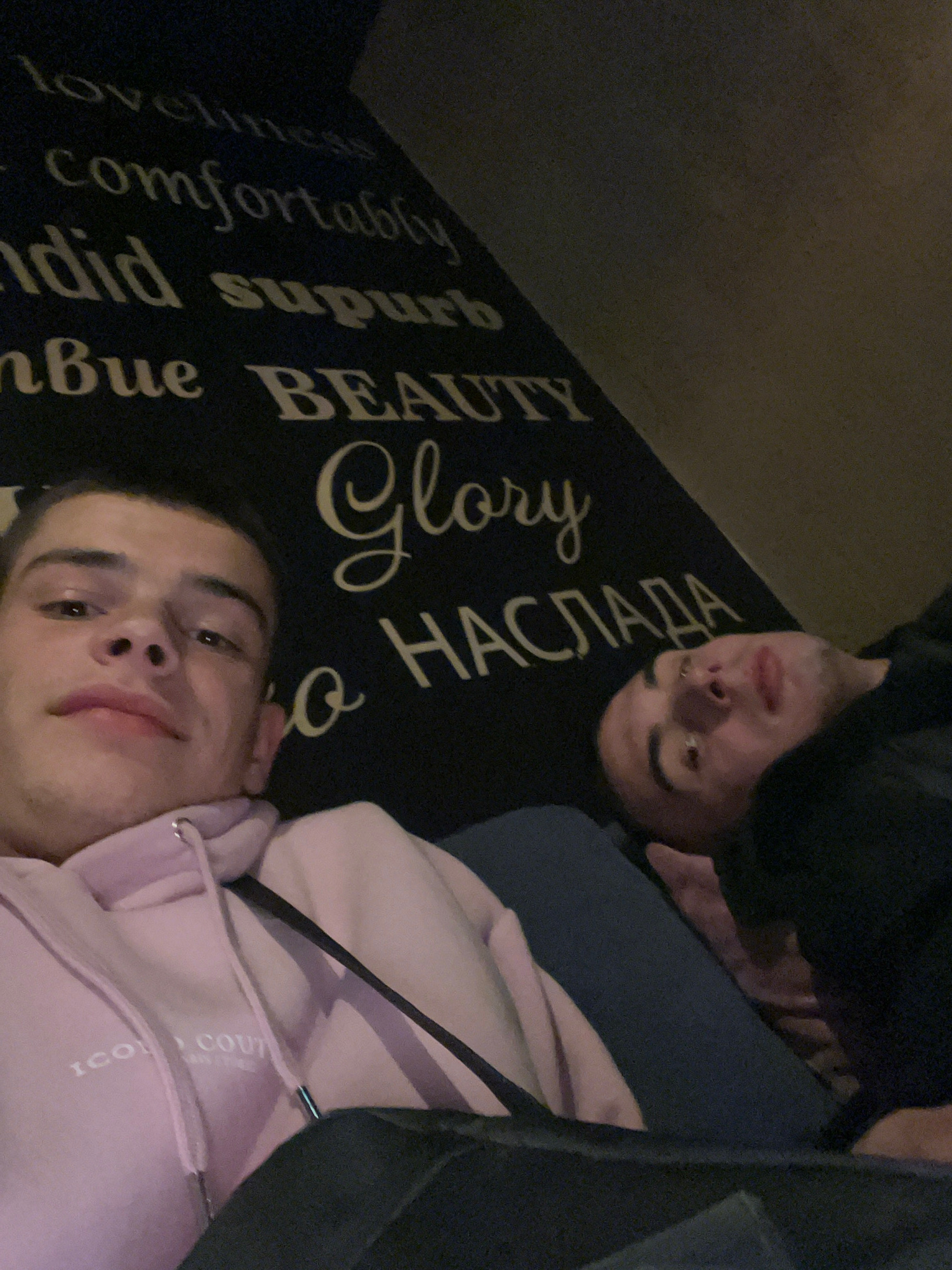 Two individuals pose in front of a black wall with white and gold lettering. The lower individual wears a light purple hoodie with visible drawstrings, while the other person above them is in darker c…read more