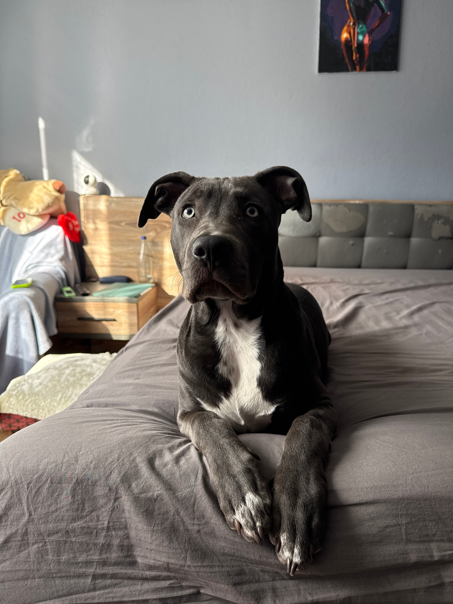 A medium-shot, rotated image depicts a gray and white Pit Bull-type dog lying on a gray bed. The dog is positioned towards the top right of the frame, with its head near the center and facing the came…read more
