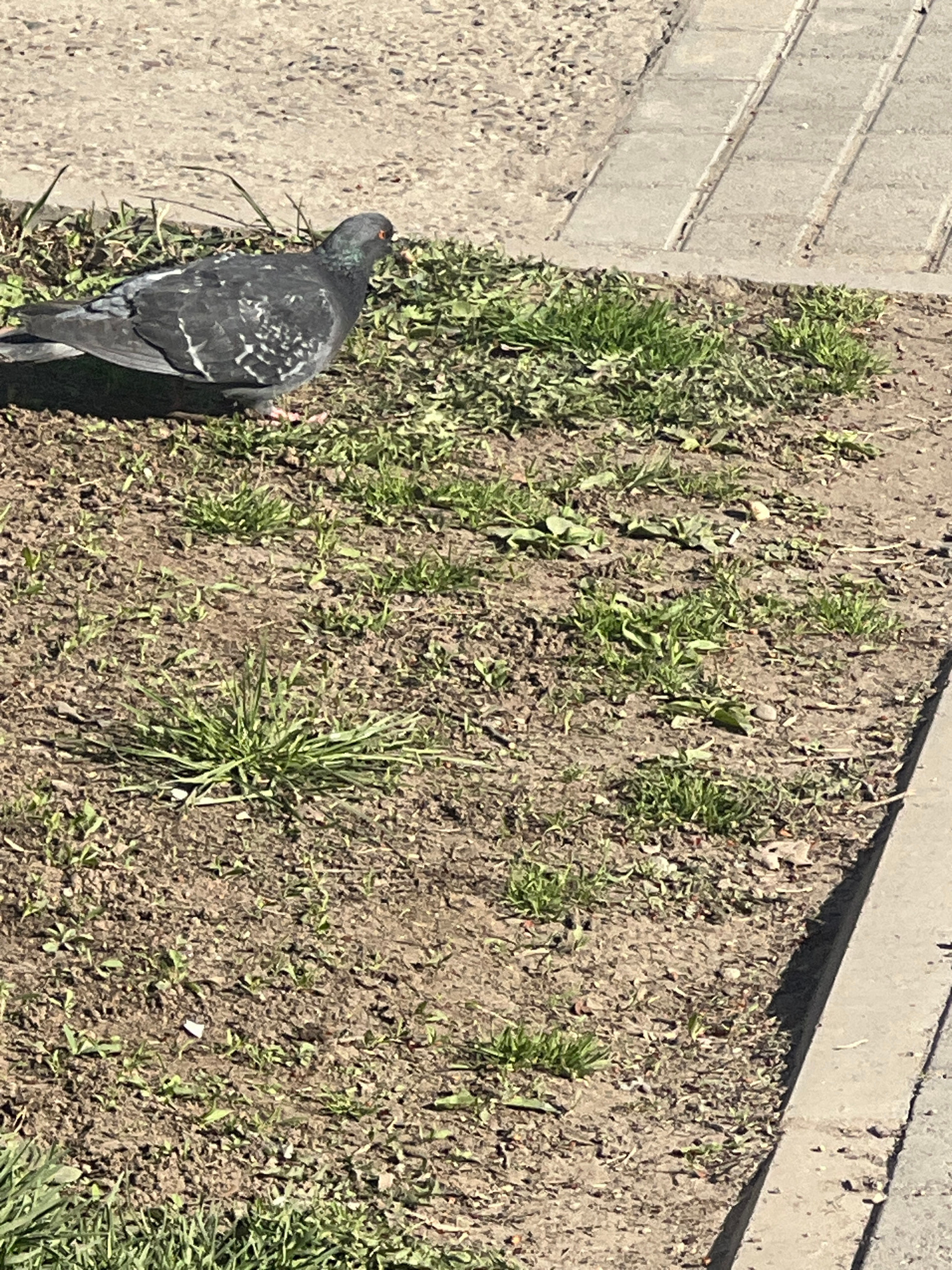 An overhead outdoor shot captures a common pigeon foraging or resting on the edge of a concrete path next to a patch of soil and sparse vegetation. The scene is brightly lit by direct sunlight, castin…read more