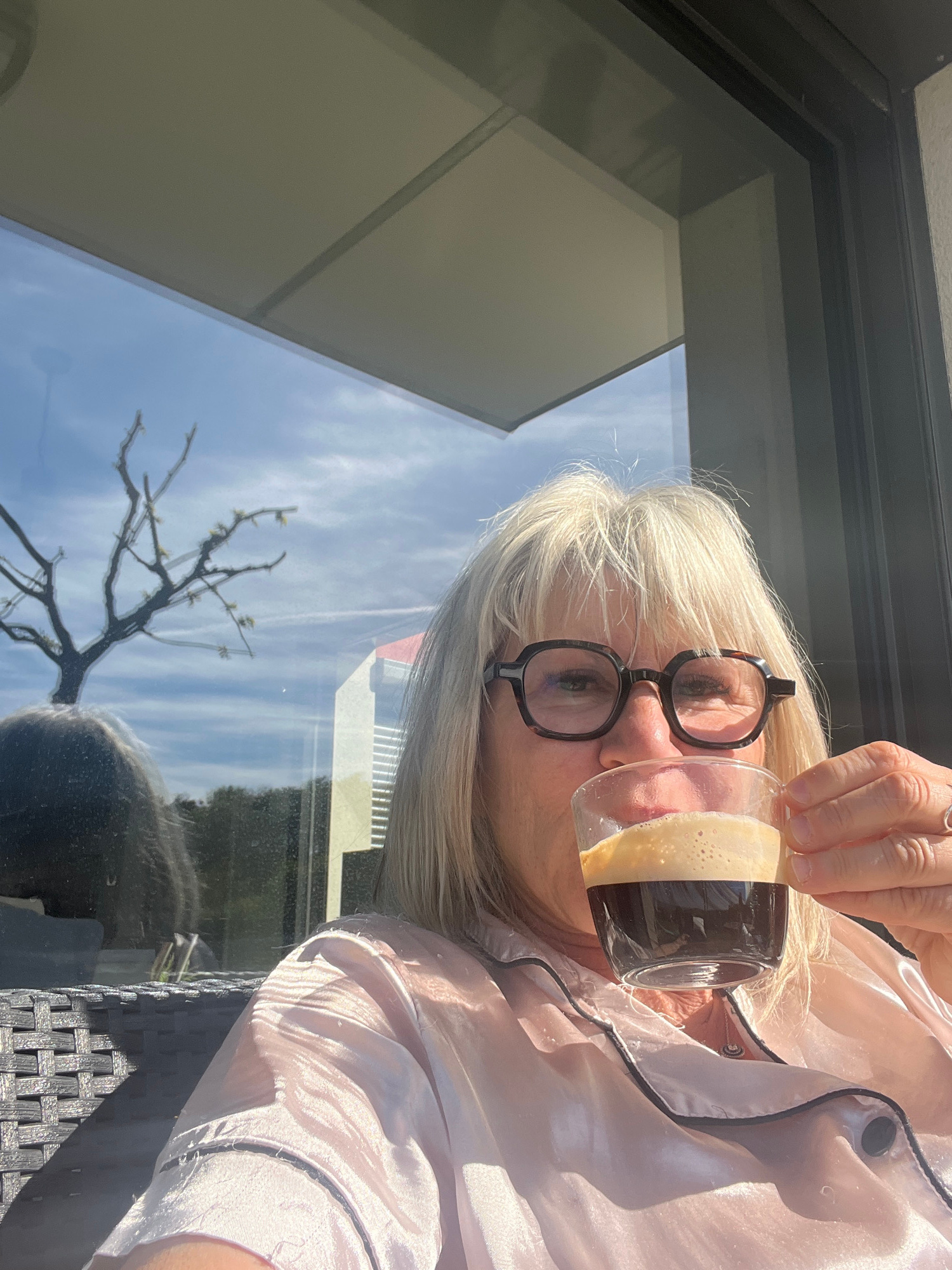 An overhead, tilted portrait shows a fair-skinned person with short, light blonde hair and tortoiseshell-framed glasses, in what appears to be a selfie. The person is holding a clear glass of a dark b…read more