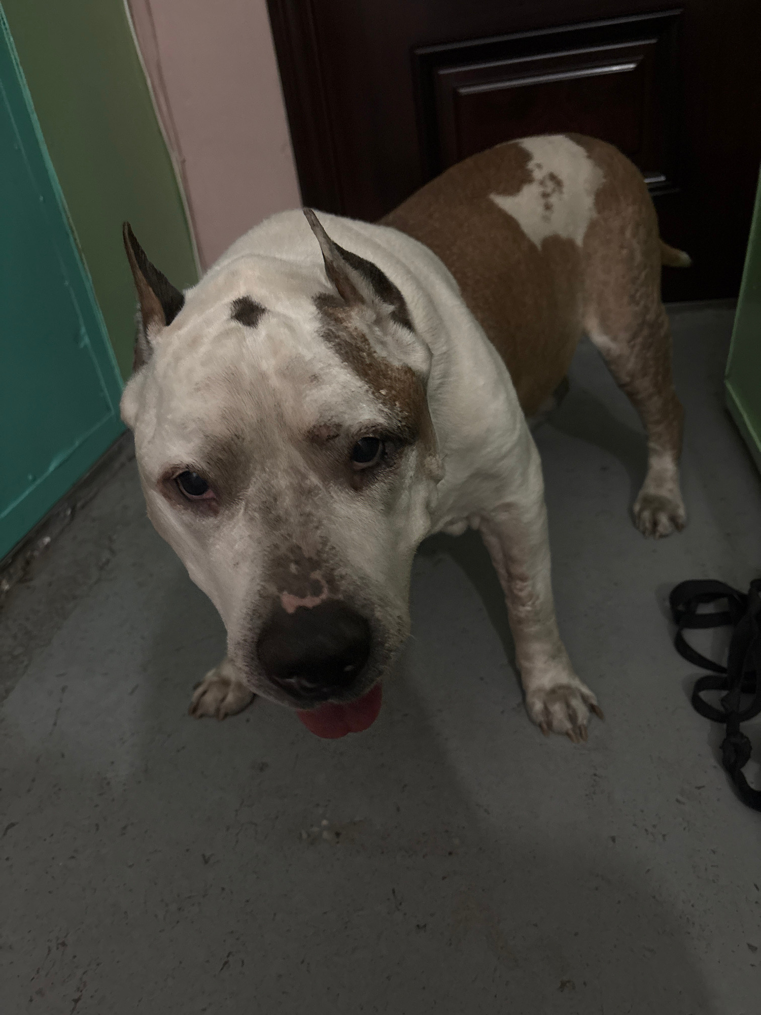 An overhead shot captures a medium-to-large sized dog, possibly a Pitbull or American Bulldog type, lying on a plain gray concrete or linoleum floor. The dog has a white coat with large brown and tan…read more