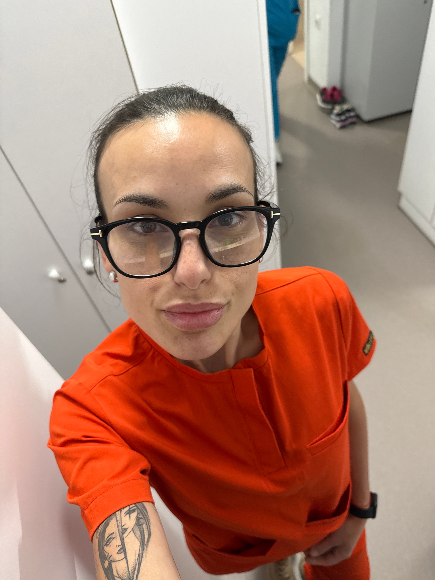 A woman with dark hair pulled back is wearing black-framed glasses and an orange garment with pockets. She is positioned in front of white cabinets with silver handles. Her left arm, bearing a tattoo,…read more